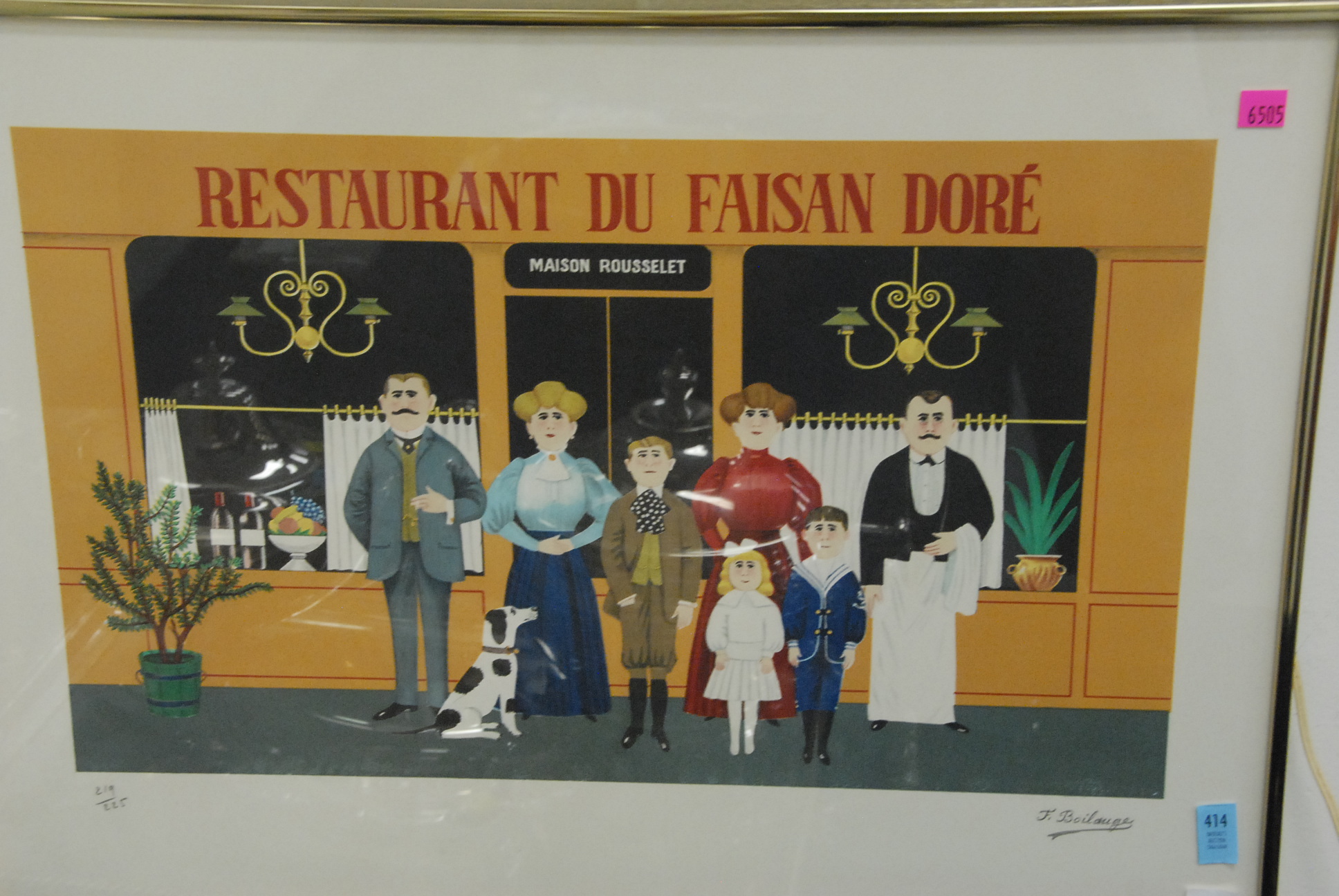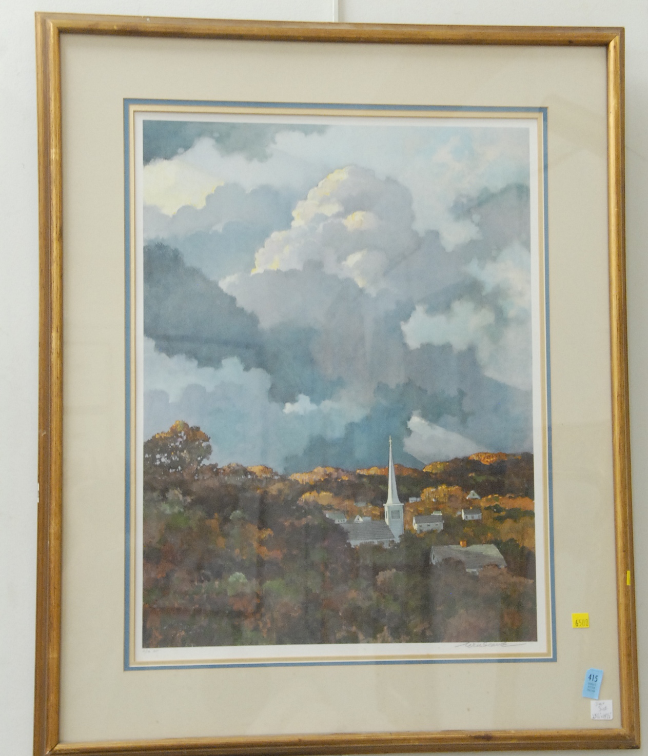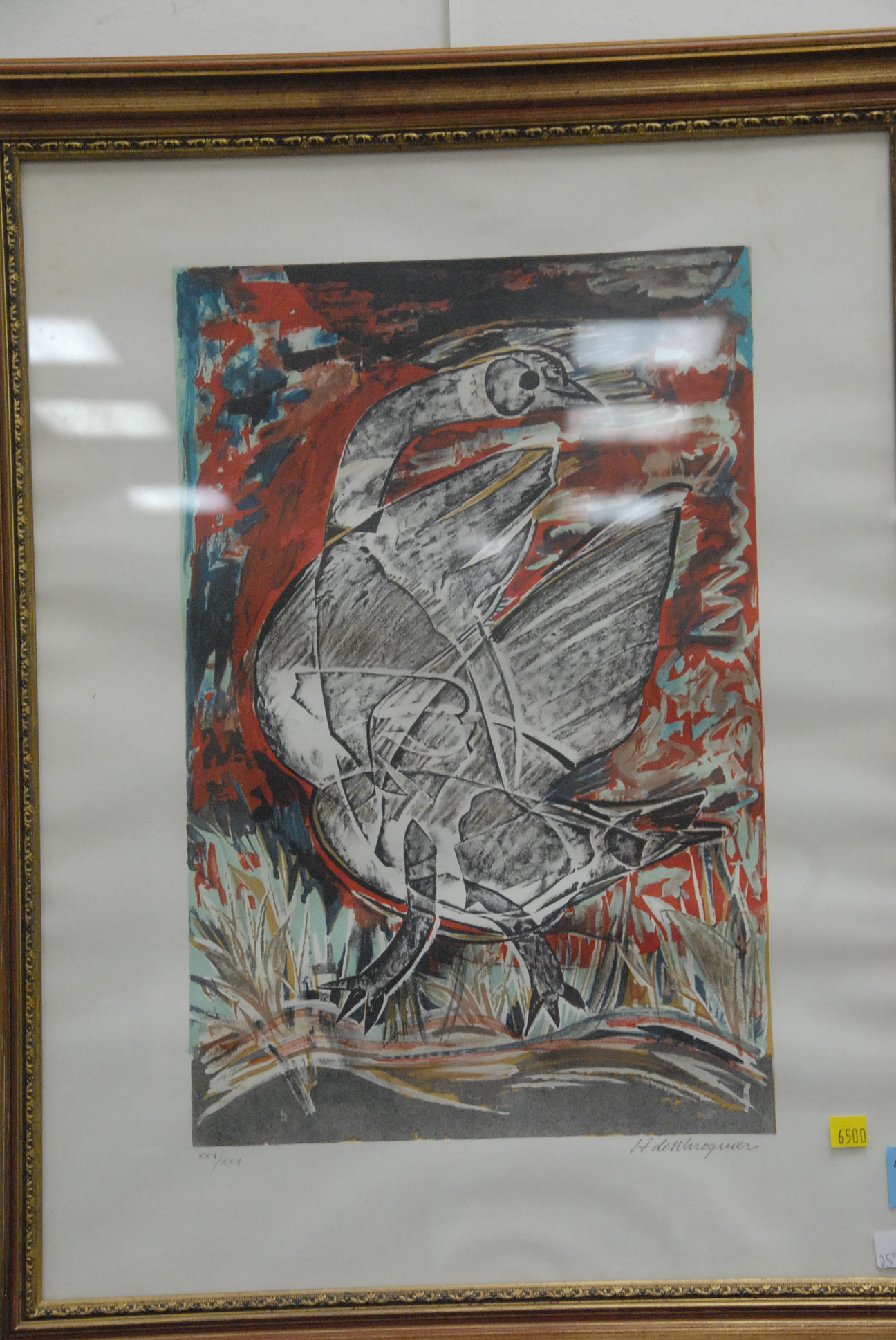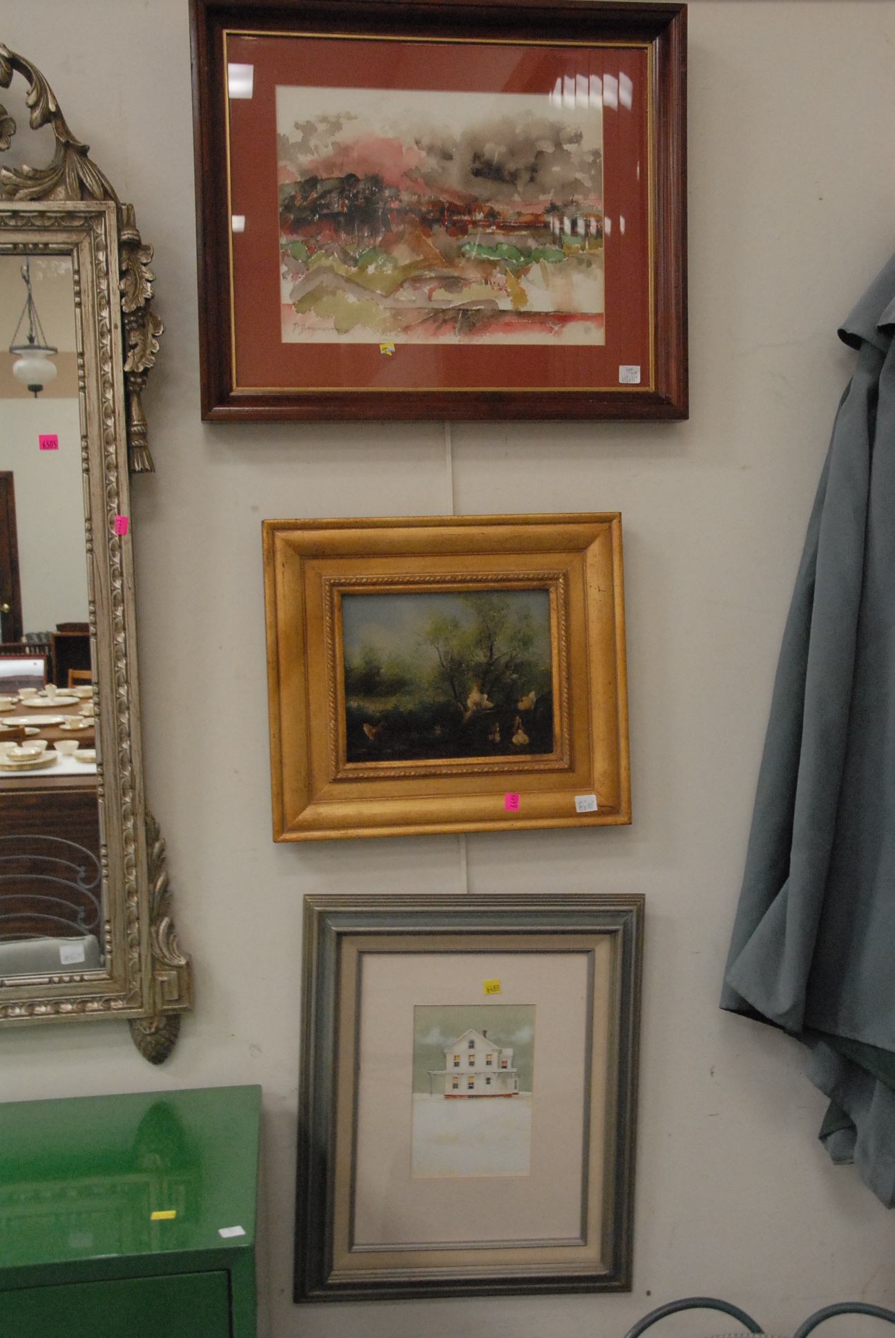 Group of five prints and painting to include Paul Zimmerman 1921-2007 watercolor landscape, 11 1/2 x 15, decorative of of chickens, etching signed Perh , 1906, 15/50, 10 1/2 x 9, Oil on canvas signed lower right Candies, and a small watercolor of a house. Provenance: Estate of Judy Gengras McDonough of West Hartford, CT.