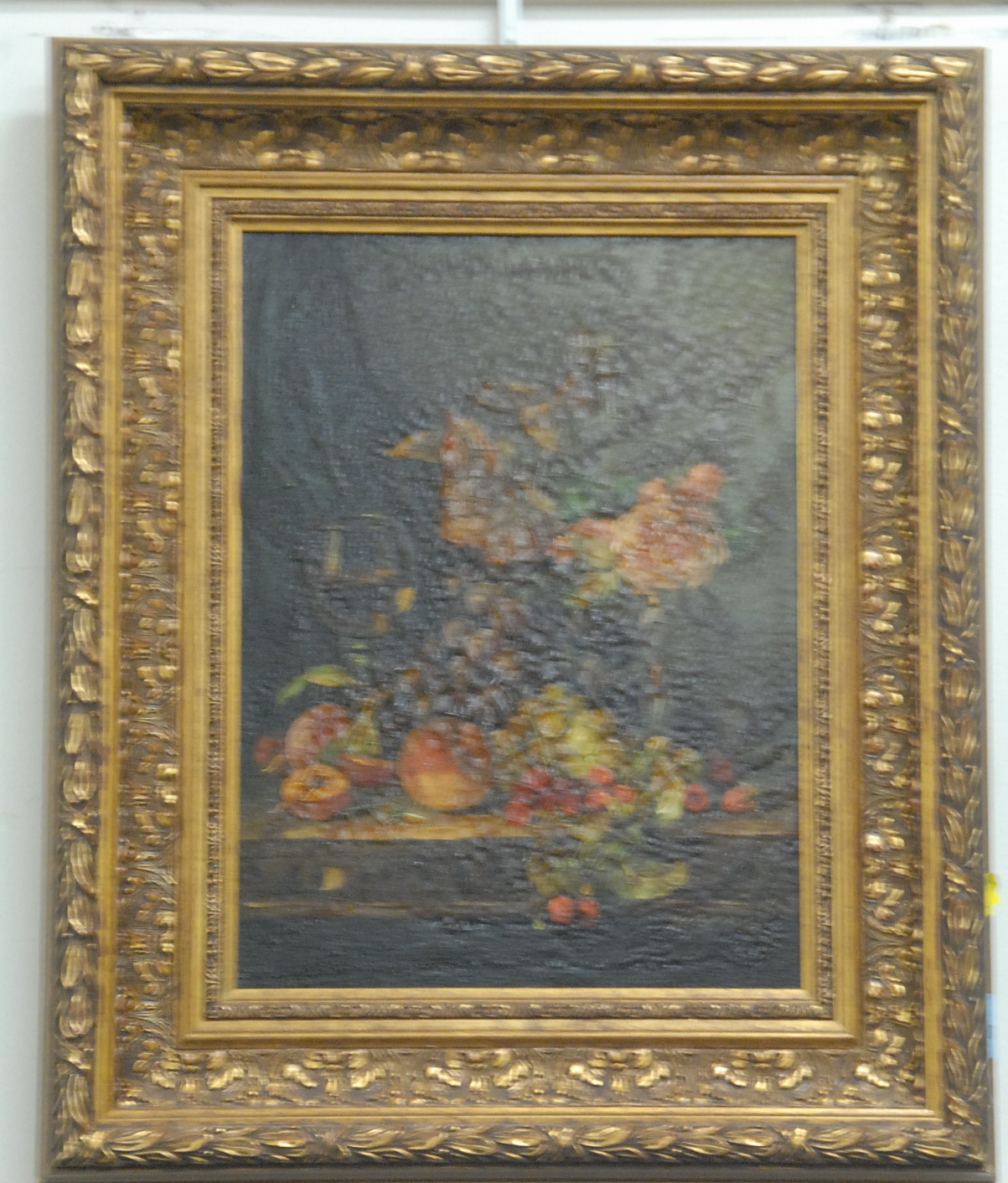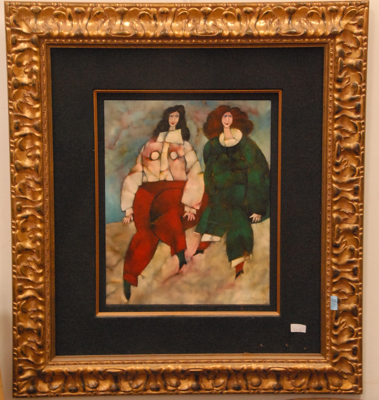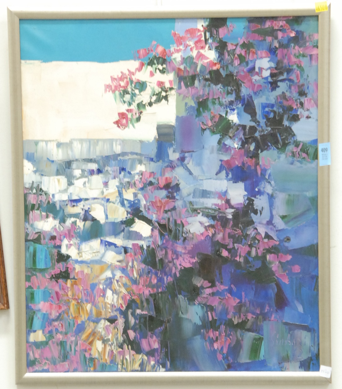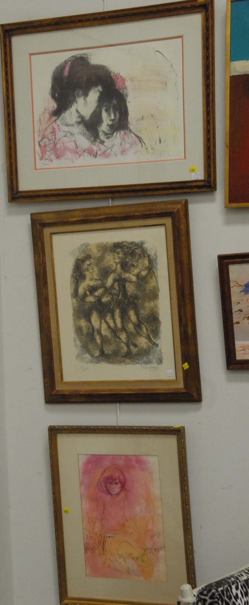 Group of five prints and painting to include Paul Zimmerman 1921-2007 watercolor landscape, 11 1/2 x 15, decorative of of chickens, etching signed Perh , 1906, 15/50, 10 1/2 x 9, Oil on canvas signed lower right Candies, and a small watercolor of a house. Provenance: Estate of Judy Gengras McDonough of West Hartford, CT.