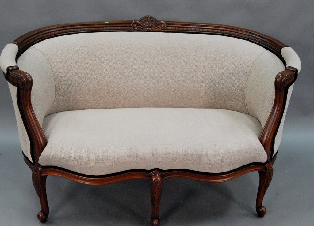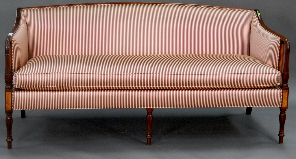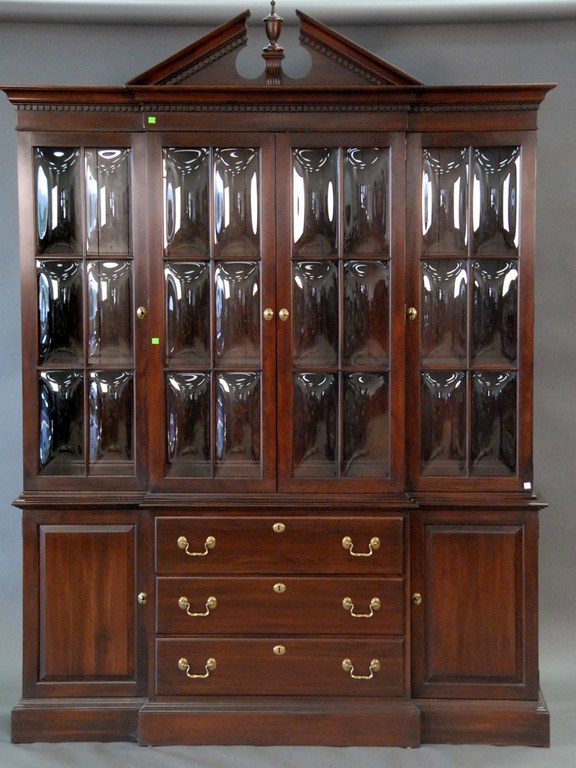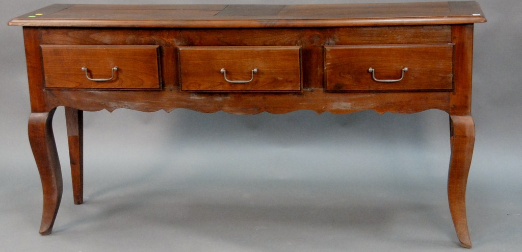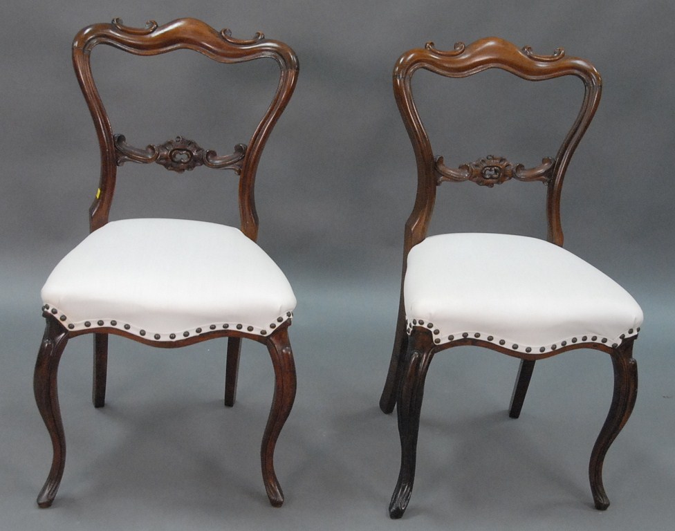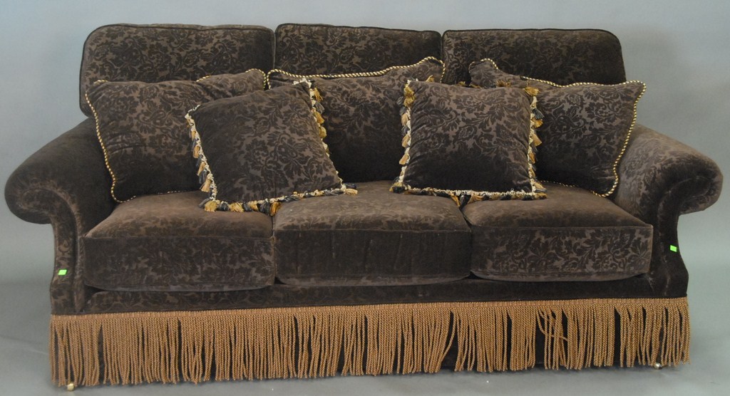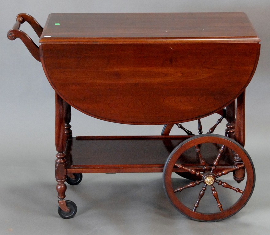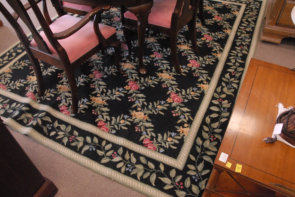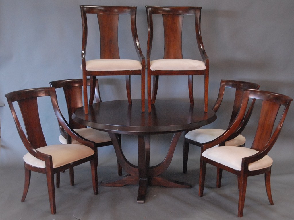Nine piece Ethan Allen dining set having oval Queen Anne style dining table and eight Queen Anne style dining chairs with upholstered seats, table: ht. 29 top: 44 x 66 with two leaves and custom pads, each leave is 18 inches, total open lg. 102in.