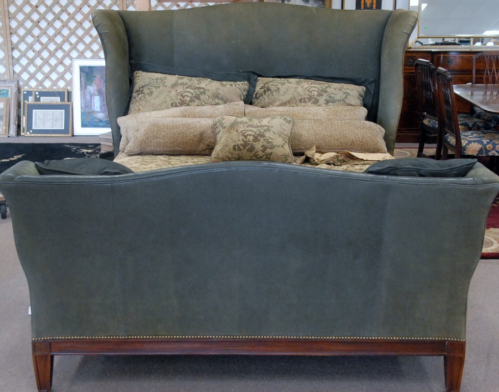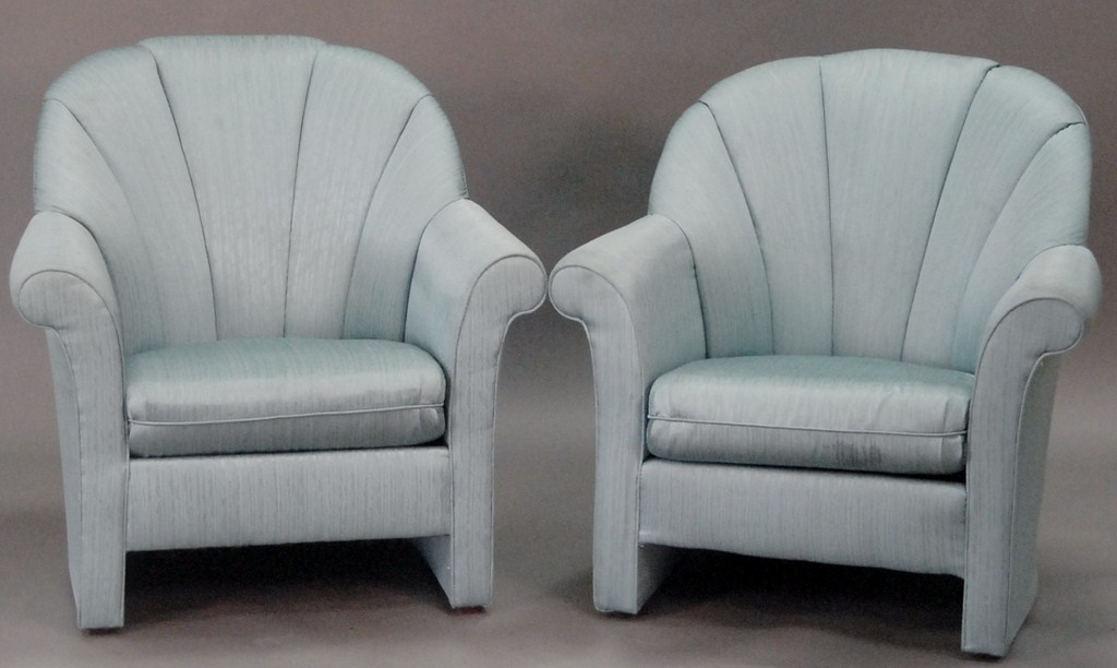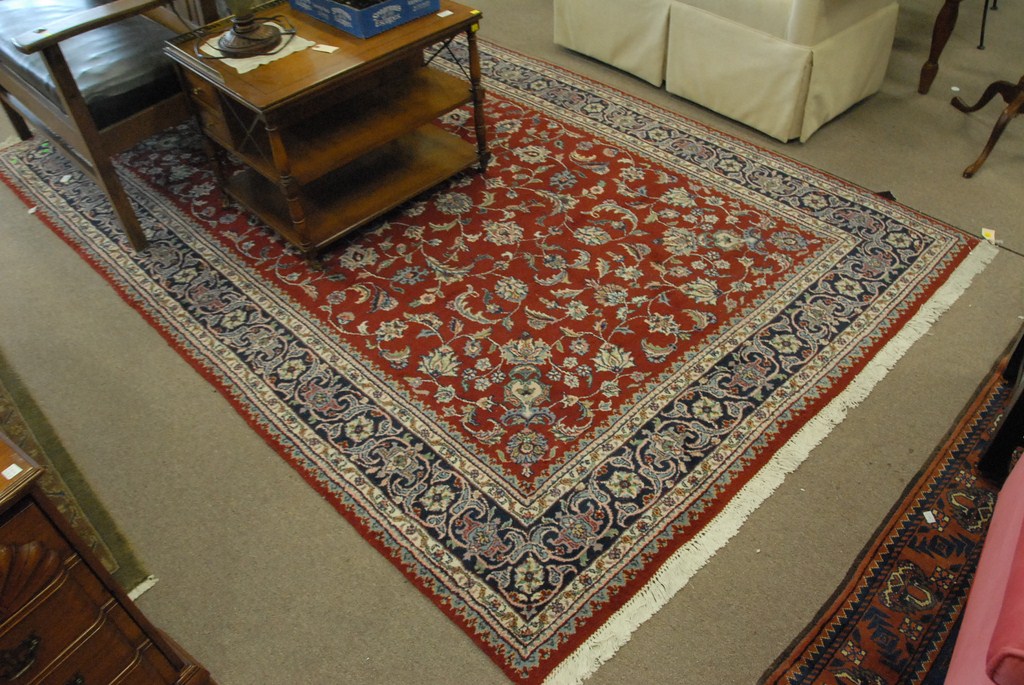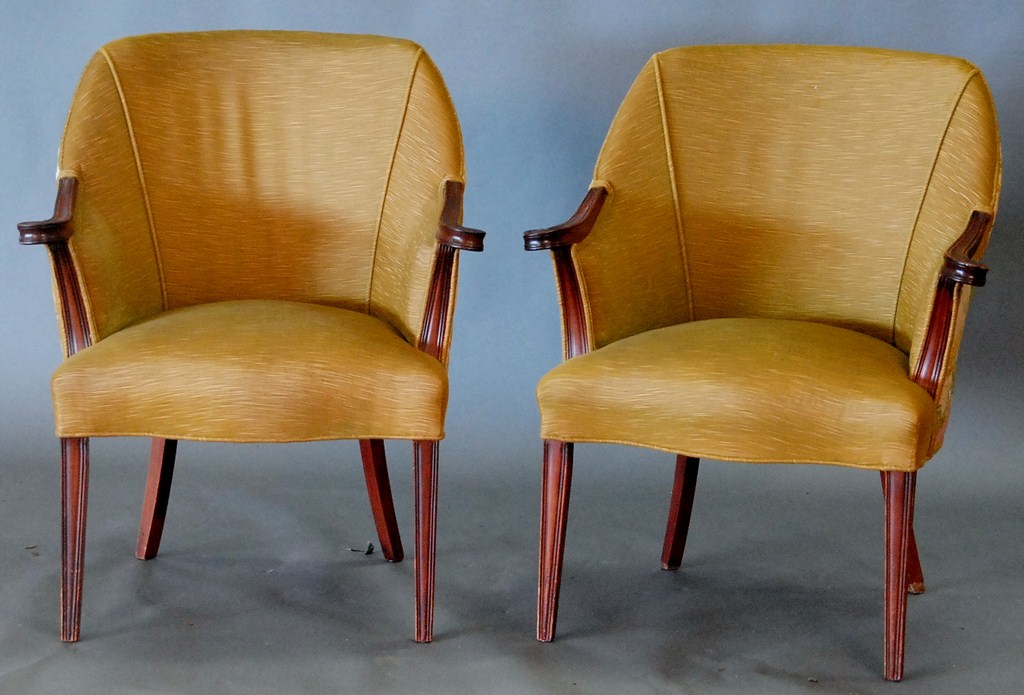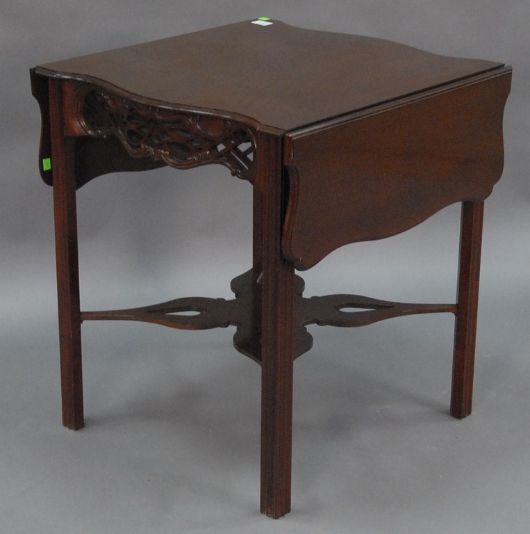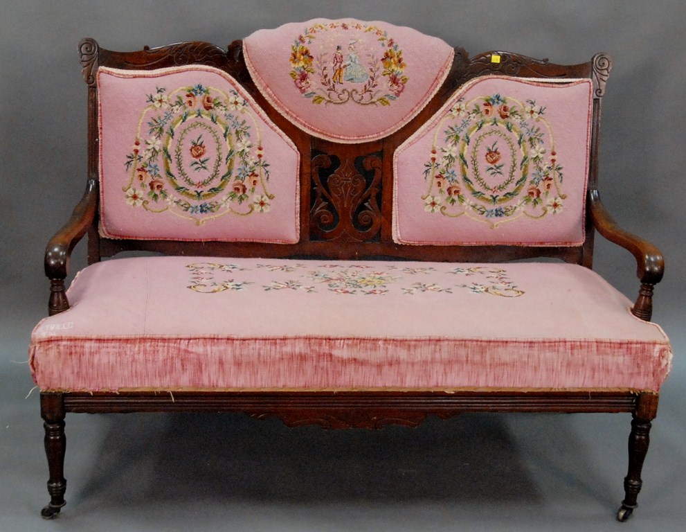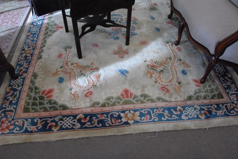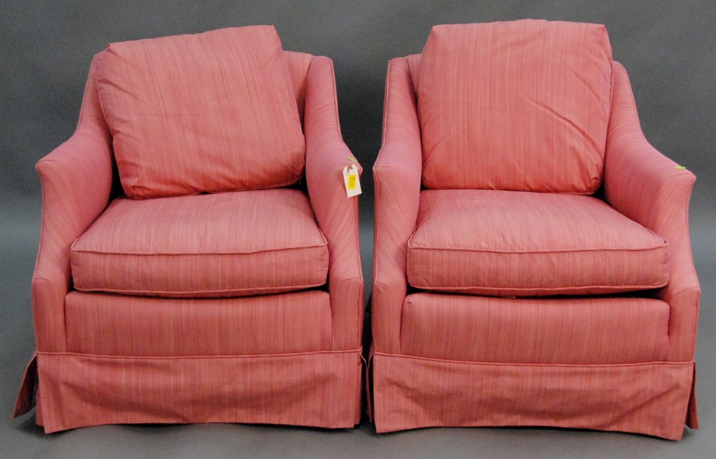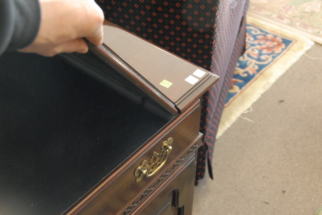 Nine piece Ethan Allen dining set having oval Queen Anne style dining table and eight Queen Anne style dining chairs with upholstered seats, table: ht. 29 top: 44 x 66 with two leaves and custom pads, each leave is 18 inches, total open lg. 102in.
