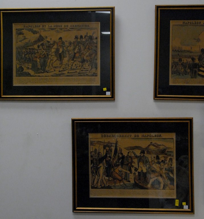 Three hand colored wood engravings Jean-Charles Pellerin 1756-1836 Napoleon et la Mere Du Grenadier, Debarqument de Napoleon, and Napoleon au Corps de Boulogne, 15 1/2 x 21.