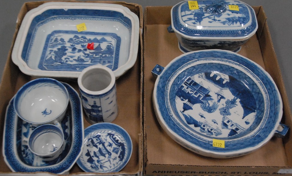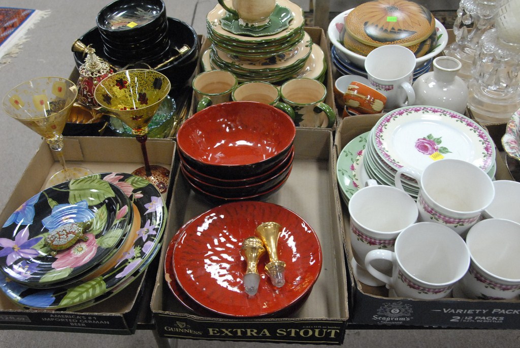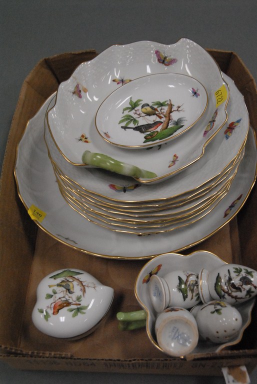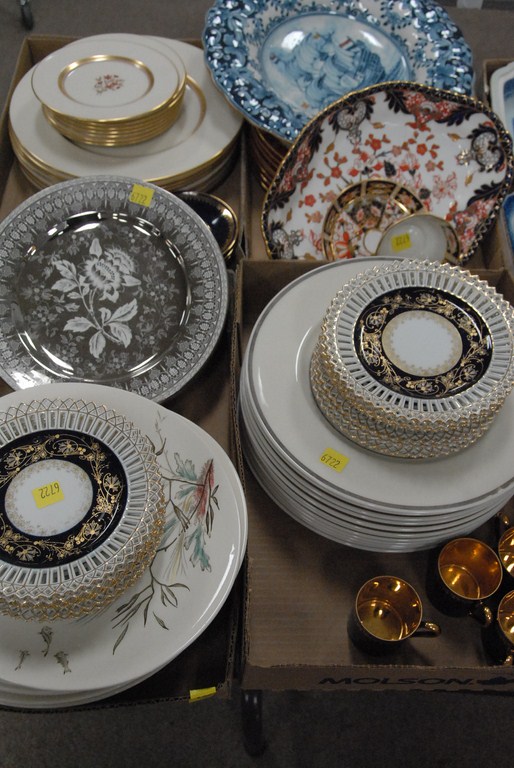 Four box lots of china including set of reticulated edged plates, Lenox bird plates, Majolica plates signed Phillips, Royal Crown Derby, Royal Worcester Georgian pattern plates, demitasse cups and saucers.