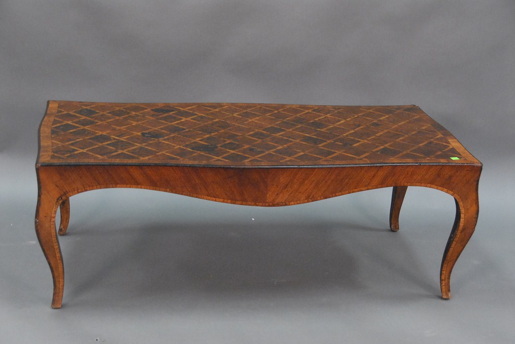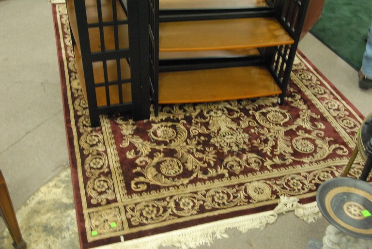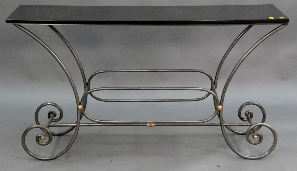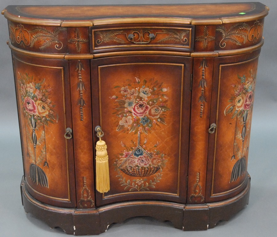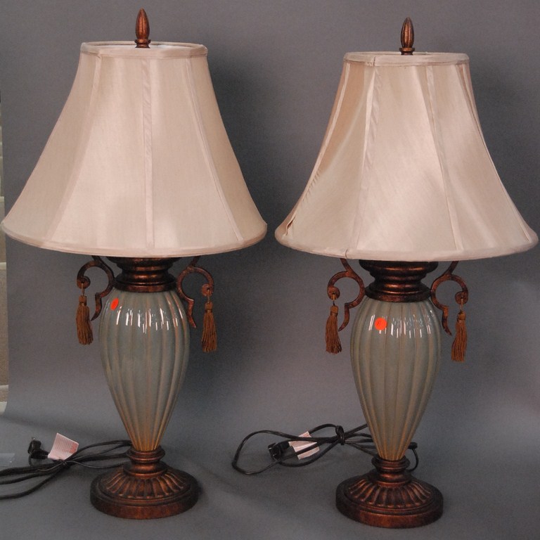 Pair of wooden tables with round tops and custom cloth upholstery, first table over skirt is Furn & Co. Bart Halpern Cocoon / Midnight Collection and underskirt Furn & Co. Creation Bauman, Virtual/2, second table green figuerd silk from Old World Weavers, ht. 30 1/2in. dia. 30 1/2in.