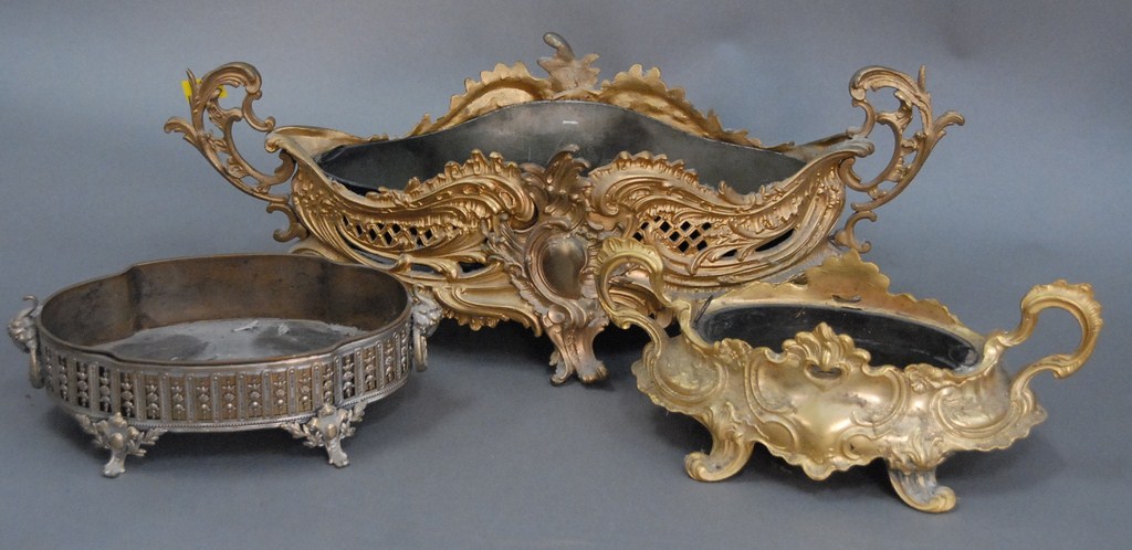 Three piece lot to include a large Louis XV style French gilt metal jardinire with insert, companion small French metal jardinire with raised feet and insert and Louis XV style gilt metal jardinire with insert.