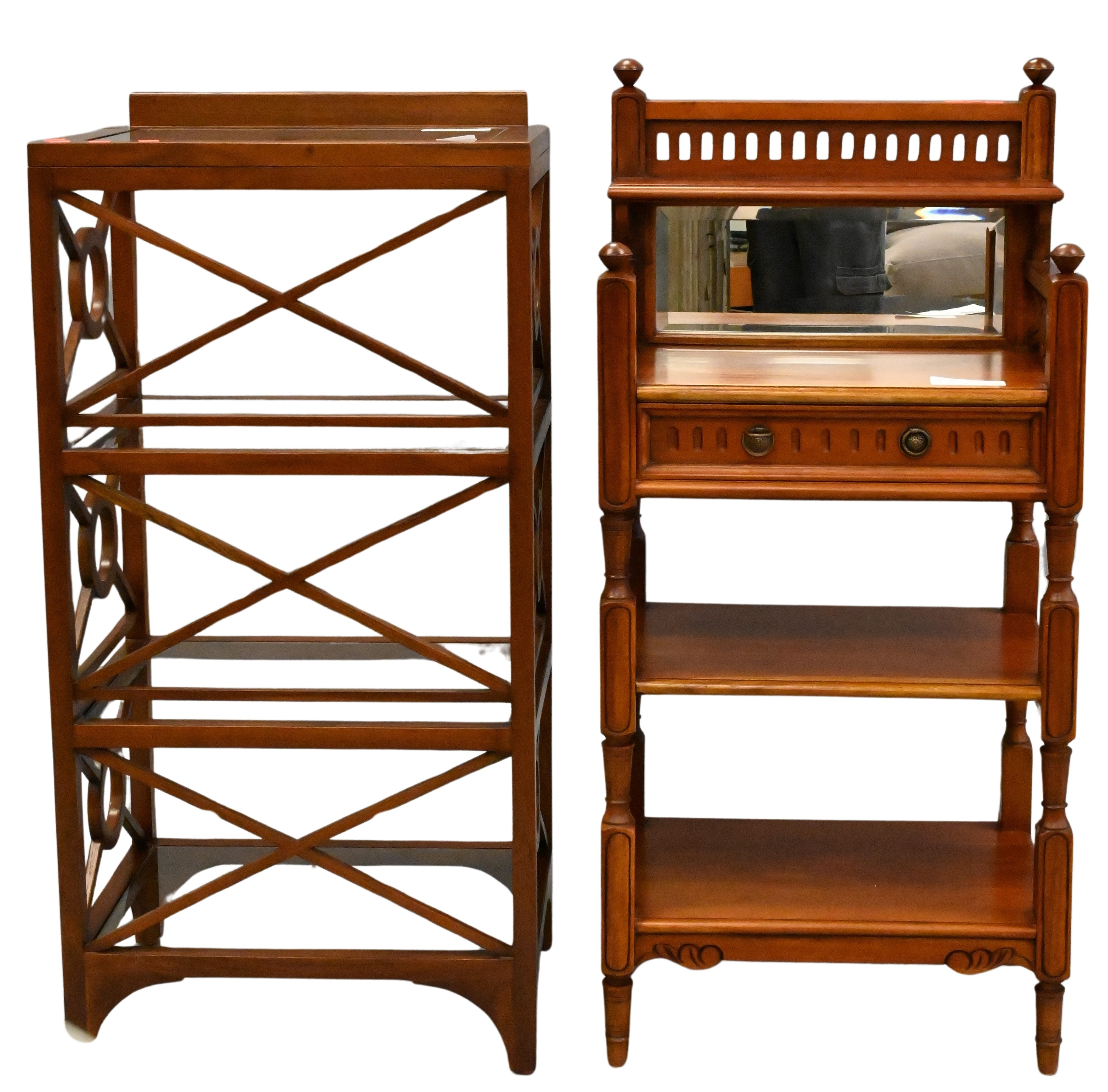 contemporary stand with glass shelves and bookstand top, Victorian stand having drawer