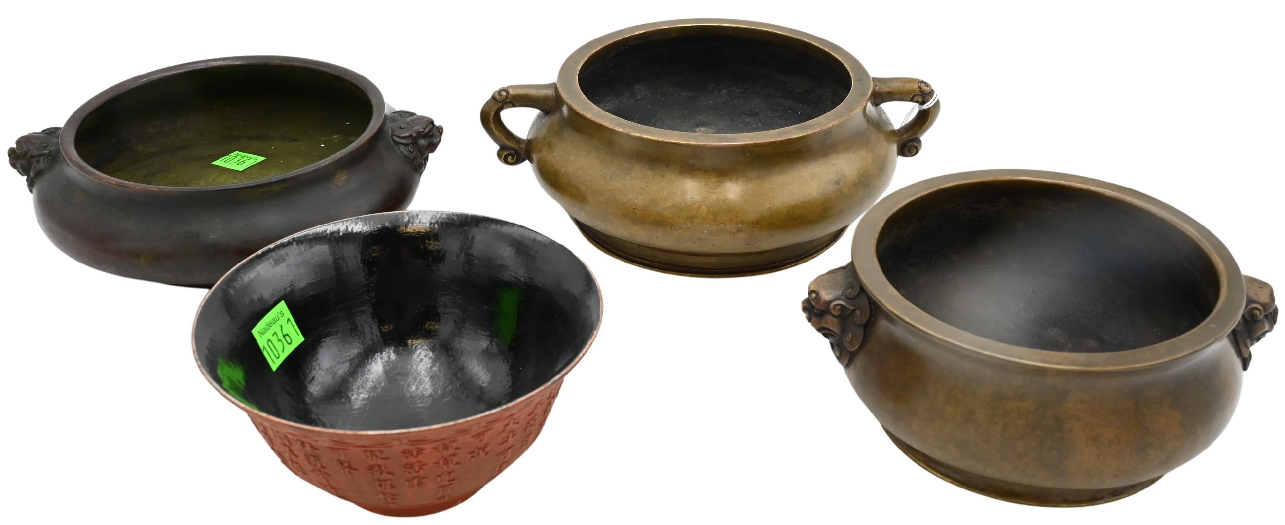 to include one censor having foo dog handles, one censor having scrolling handles, one stout censor having foo dog handles, along with imitation red carved lacquer bowl having character marks on base