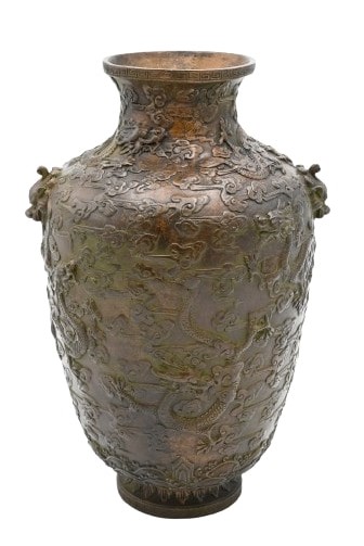 of baluster form, having dragon mask handles and high relief dragon motif throughout, character marks on base