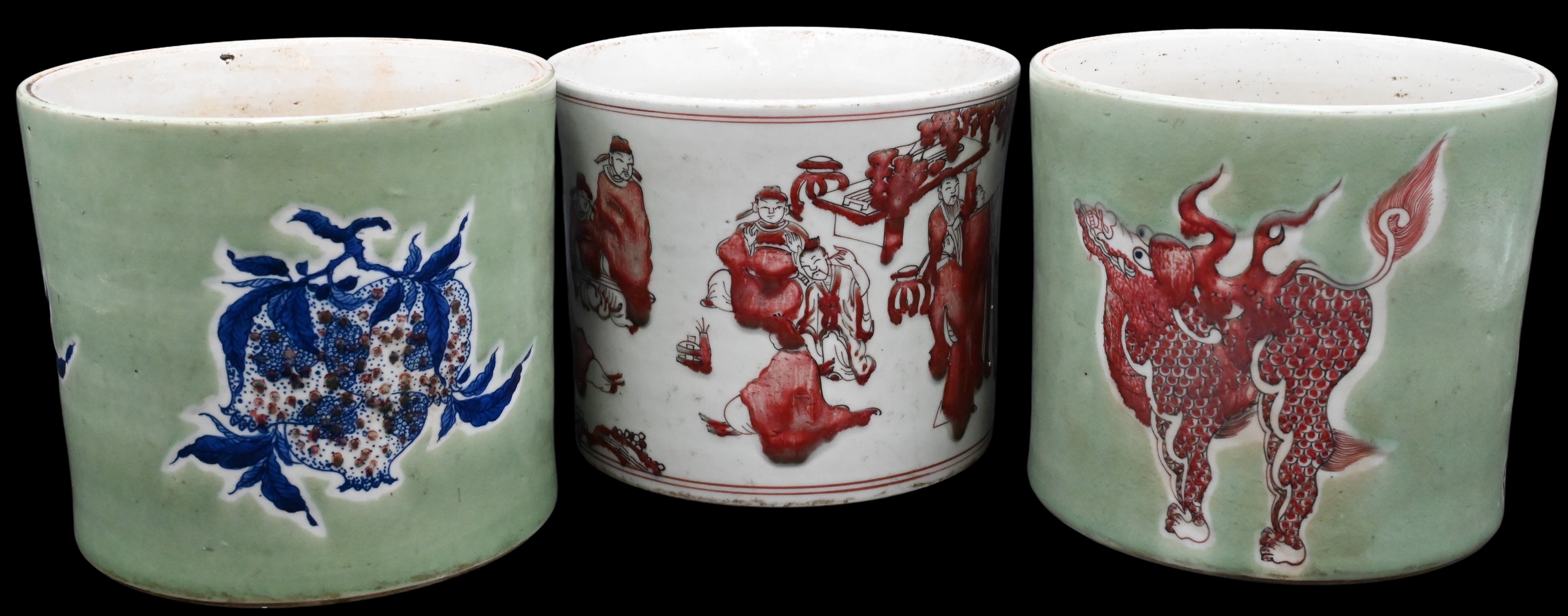 to include one pot having underglaze copper and red brush motifs, one celadon pot having underglaze copper and red and blue brush botanical motifs, one celadon pot having underglaze copper and red and blue foo dog motifs
