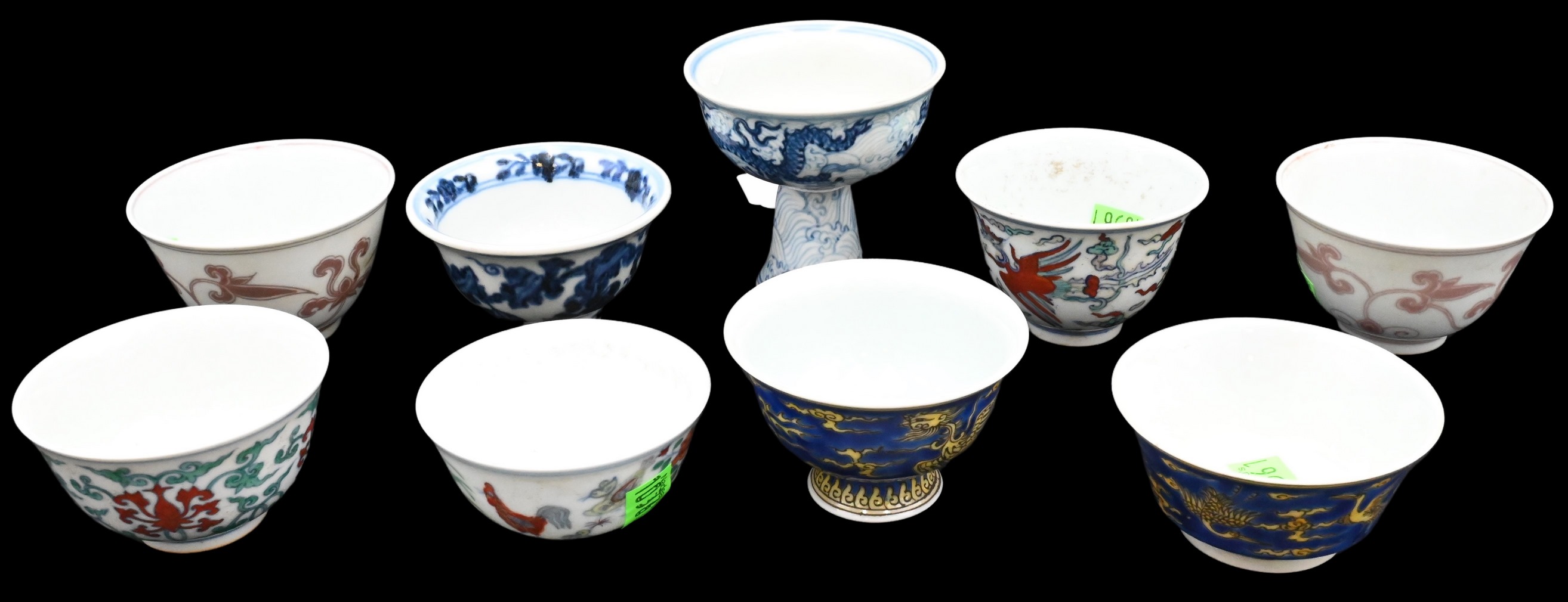 to include one blue and white stem cup having dragon motif, two underglaze copper and red cups, one blue and white cup having vine motif, three cups having iron red, blue, green, and yellow brush work, along with two blue and yellow phoenix cups