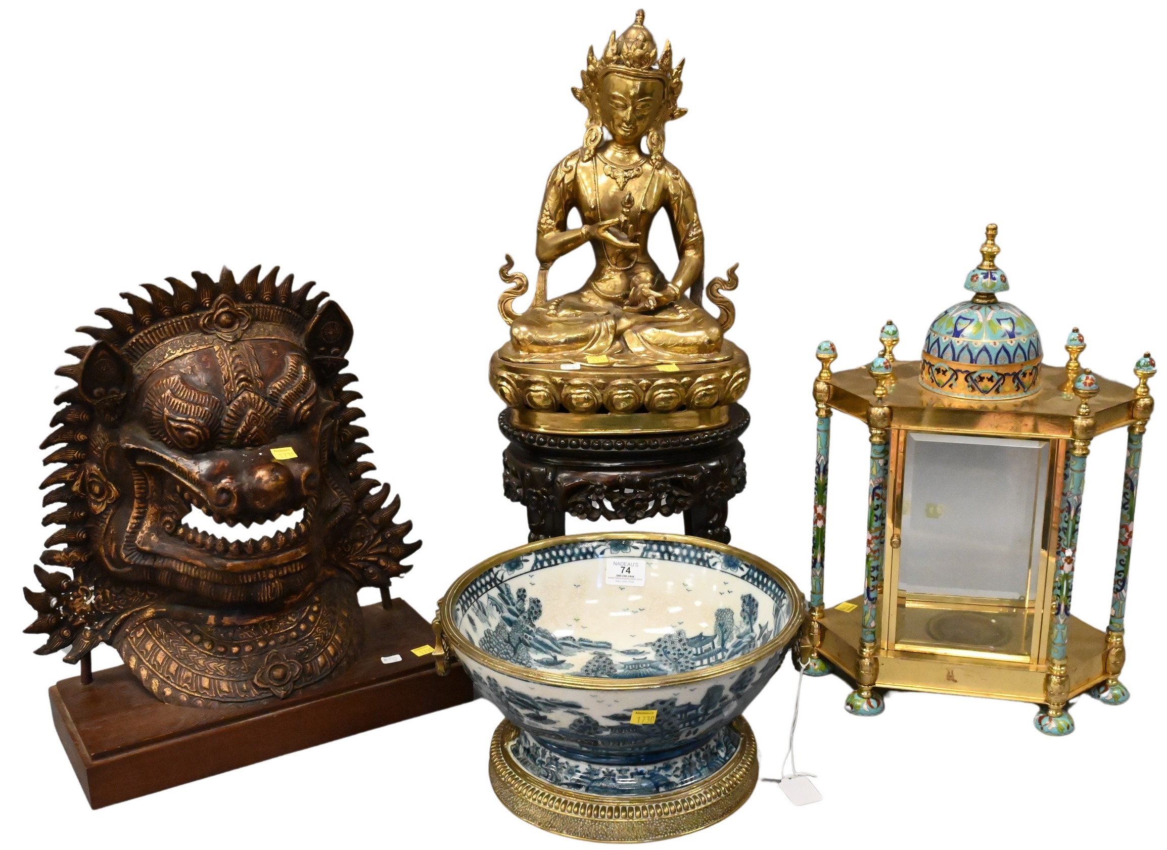 to include brass and enameled clock case, a blue and white porcelain footed bowl having brass mounts, large brass seated Buddha on carved Chinese oval table form base and lion mask