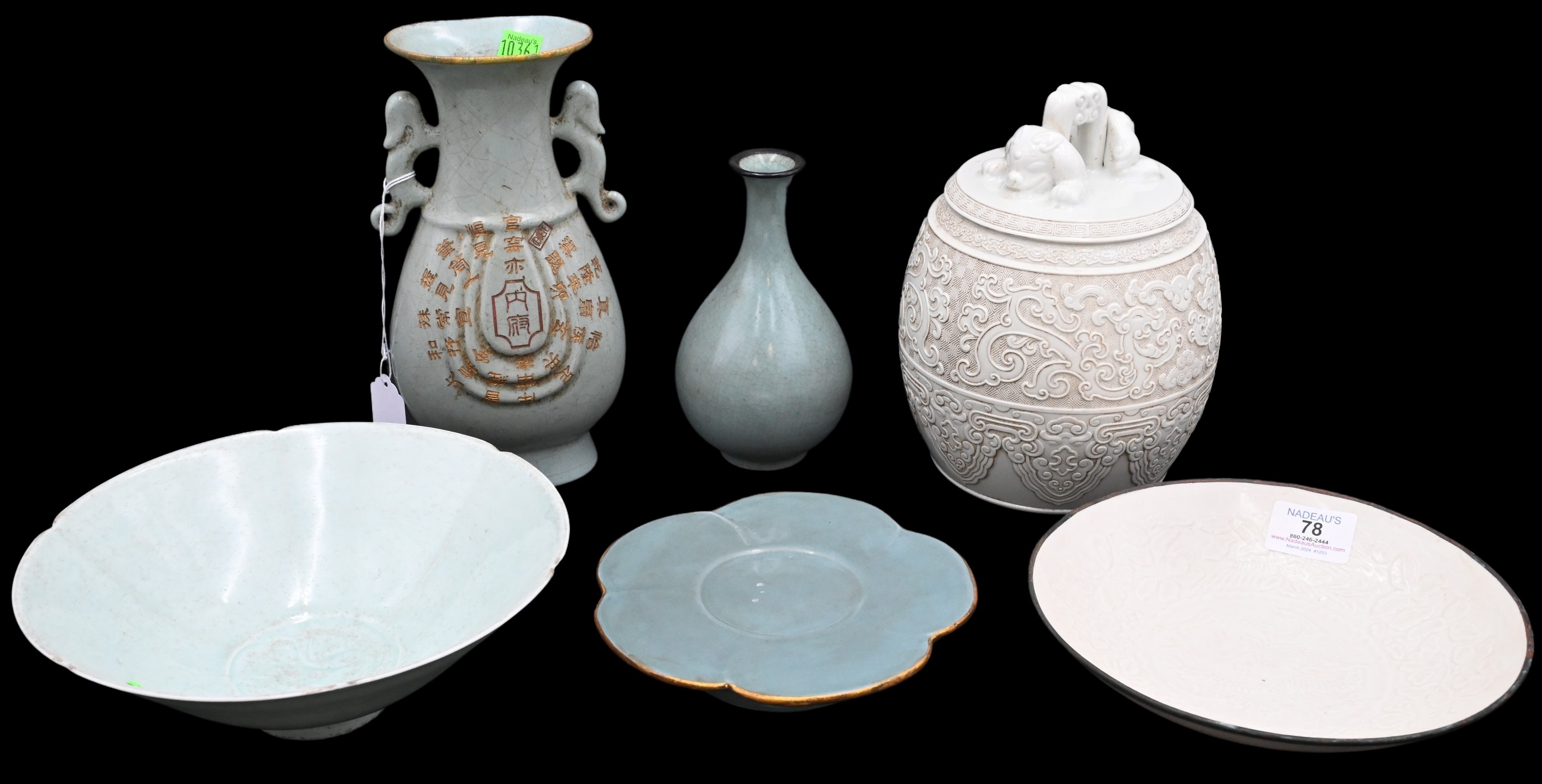 to include vase having bronze rim, Chinese imitation white carved lacquer bell, footed plate with gilt rim, footed bowl with fish motif to center, dragon handled vase having character marks throughout, ding-ware style plate/bowl