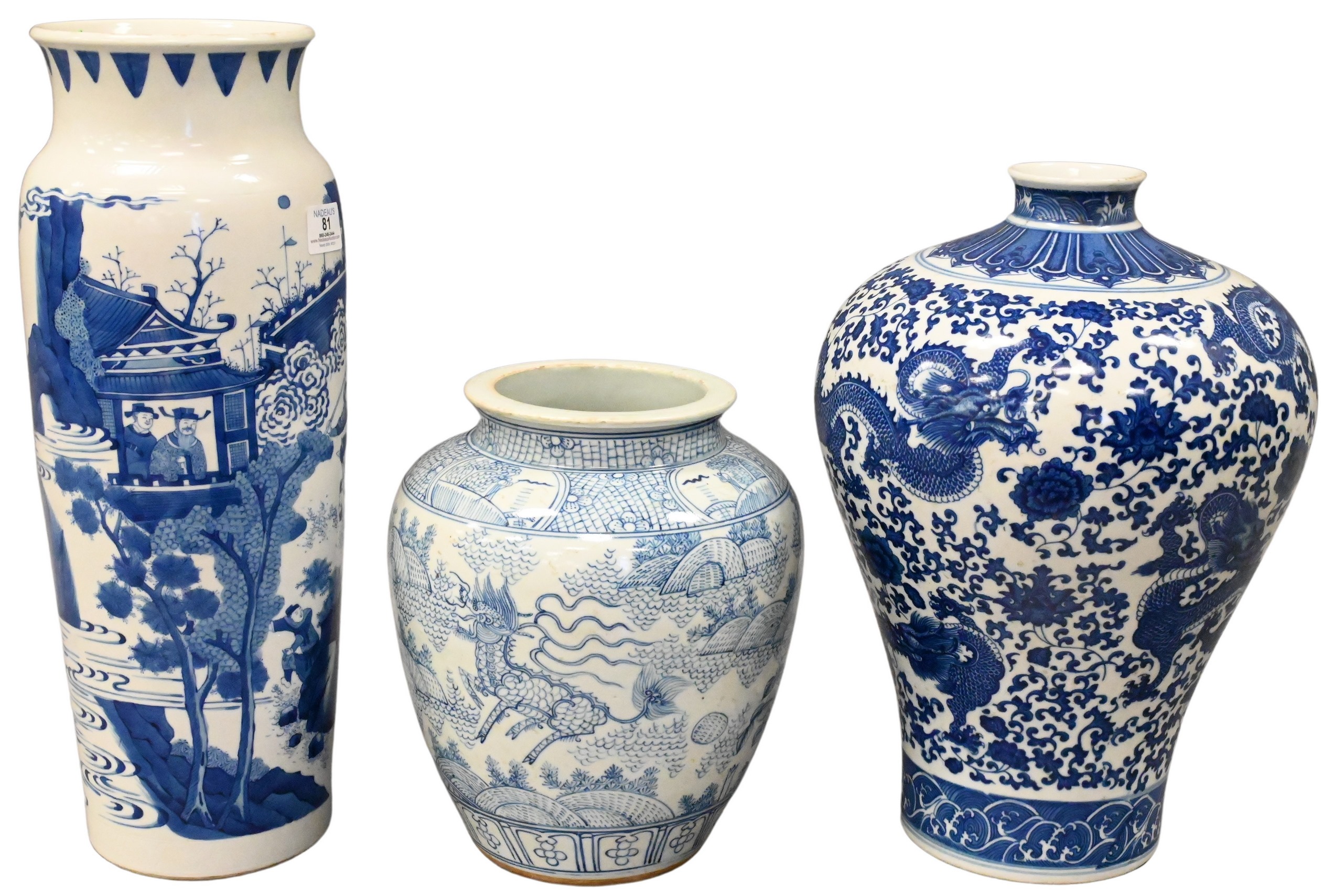to include one jar having dragon and agricultural motif, one sleeve form vase having battle motif, one Meiping style vase having dragon motif having character marks on base