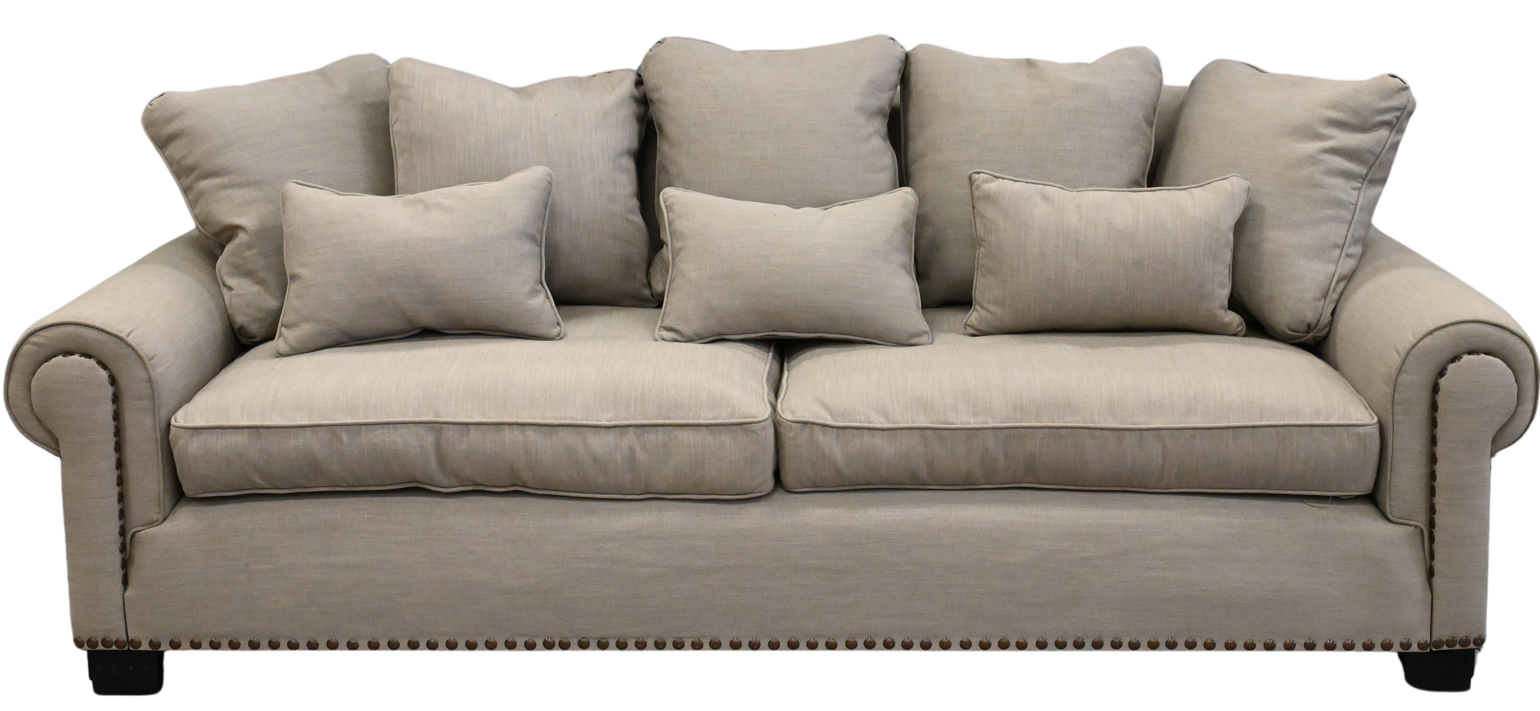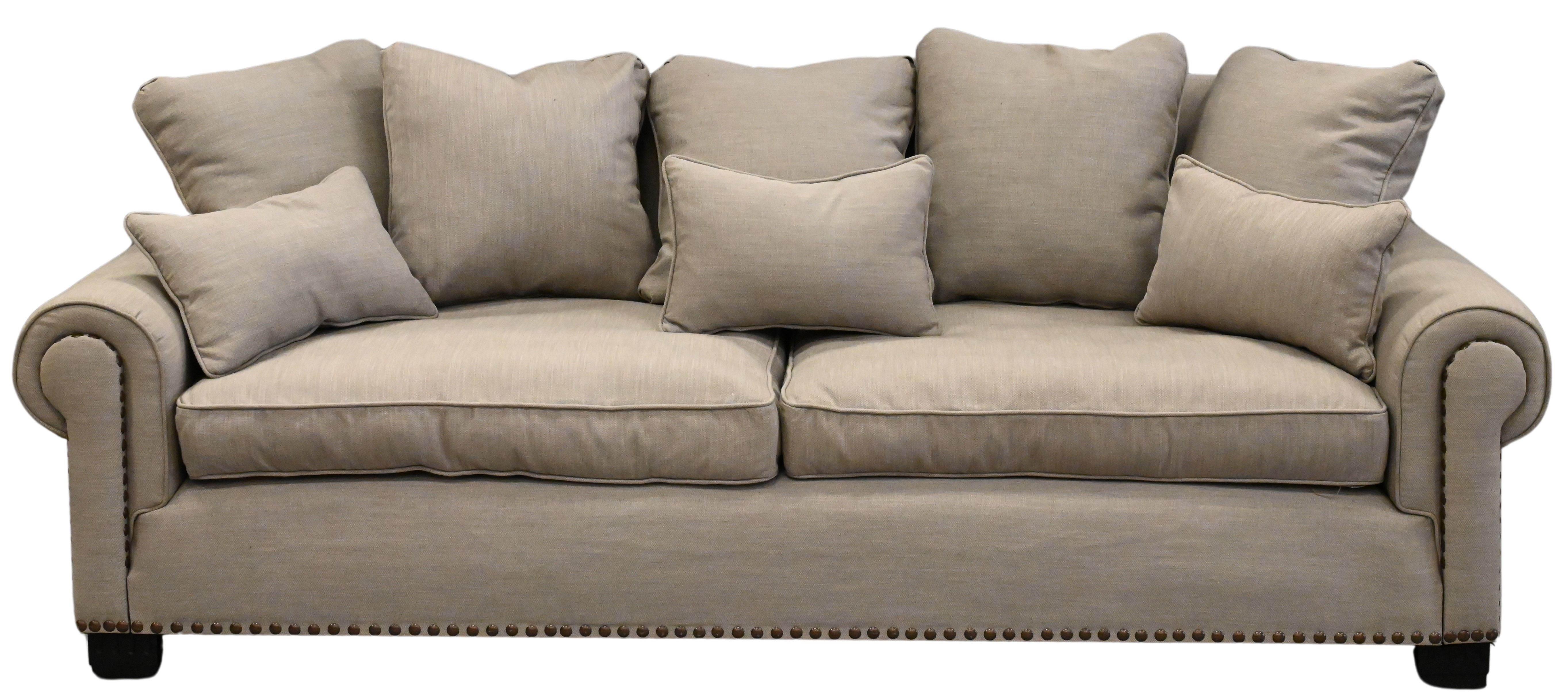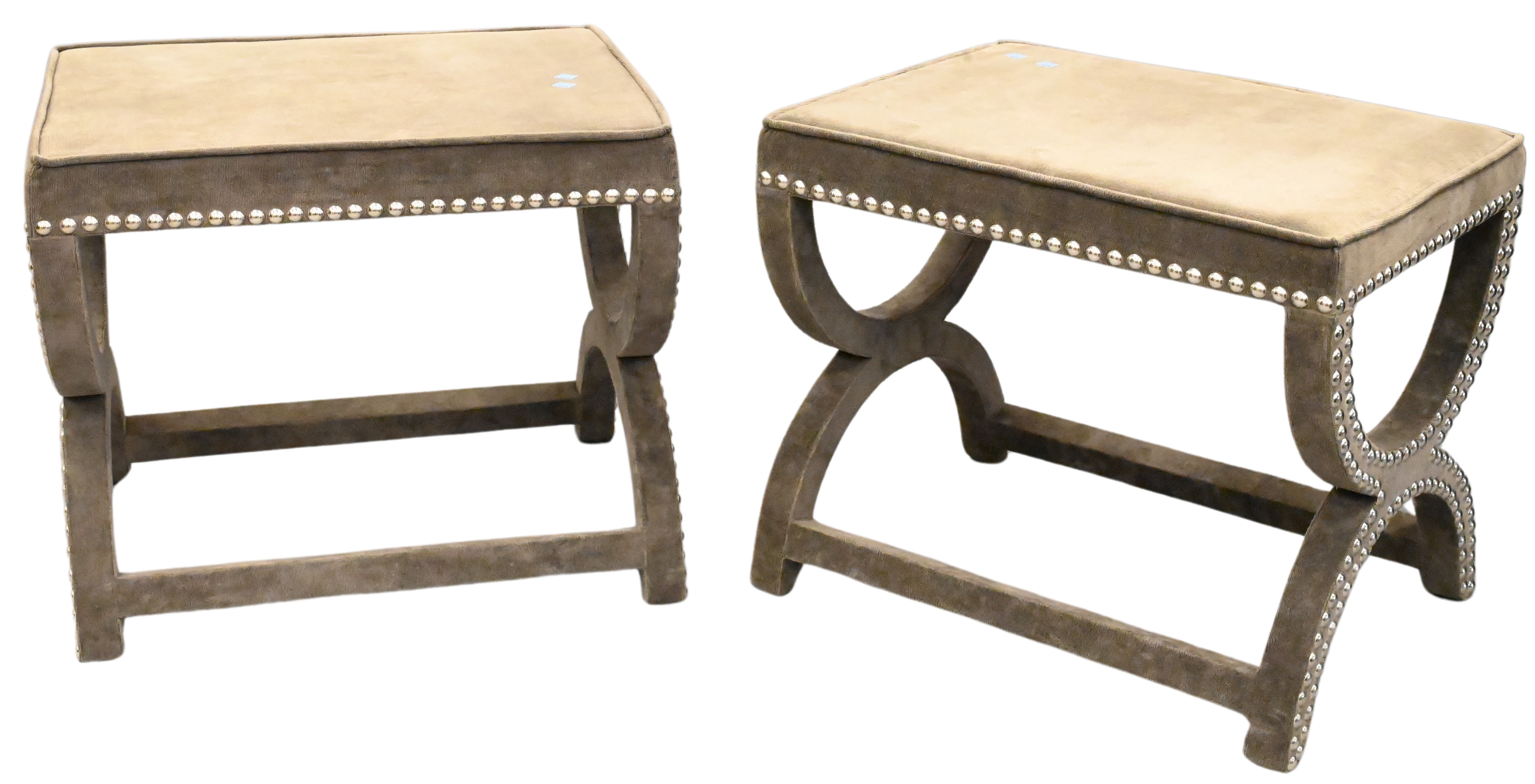 having taupe velvet upholstery with nailhead accents