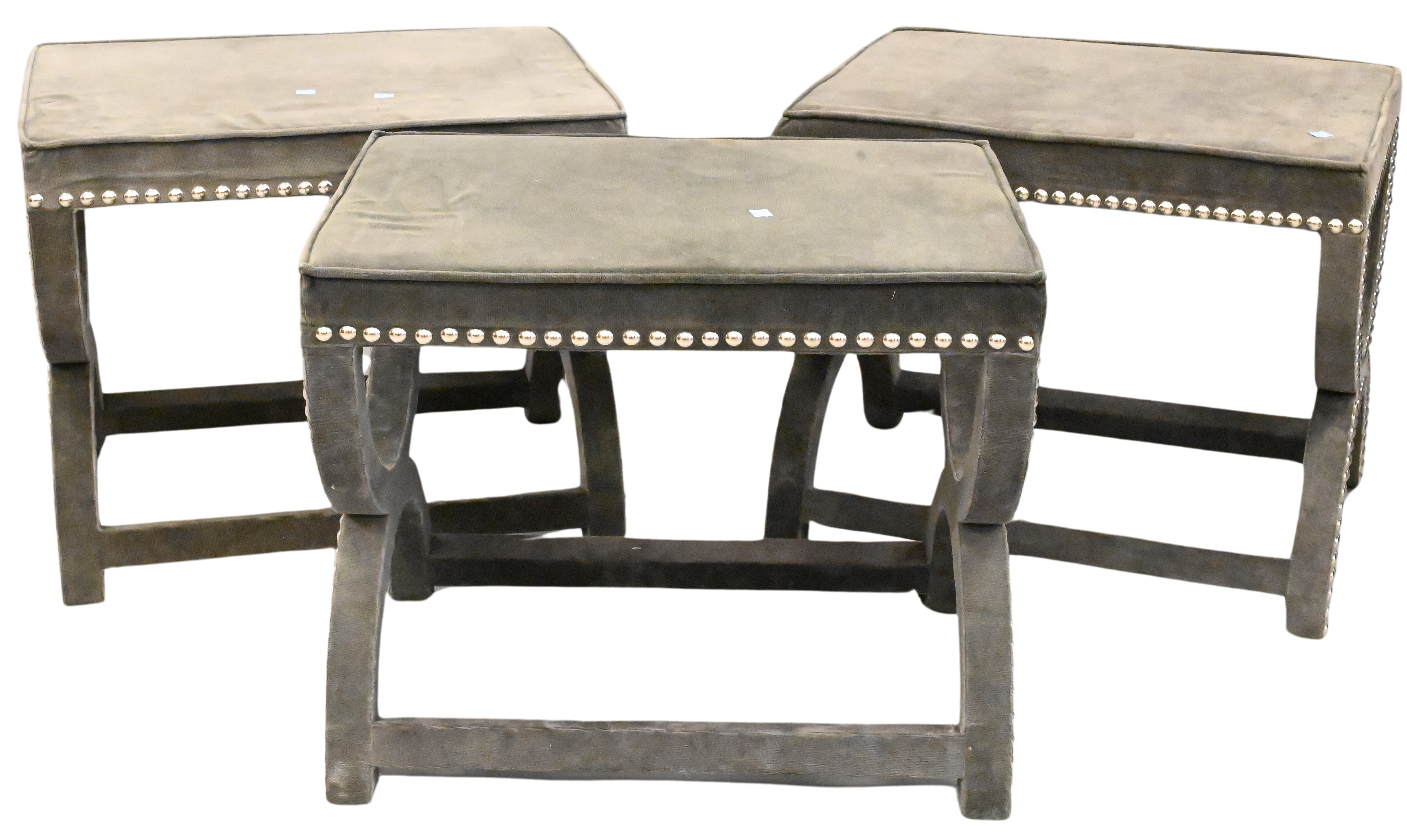 having gray velvet upholstery with nailhead accents