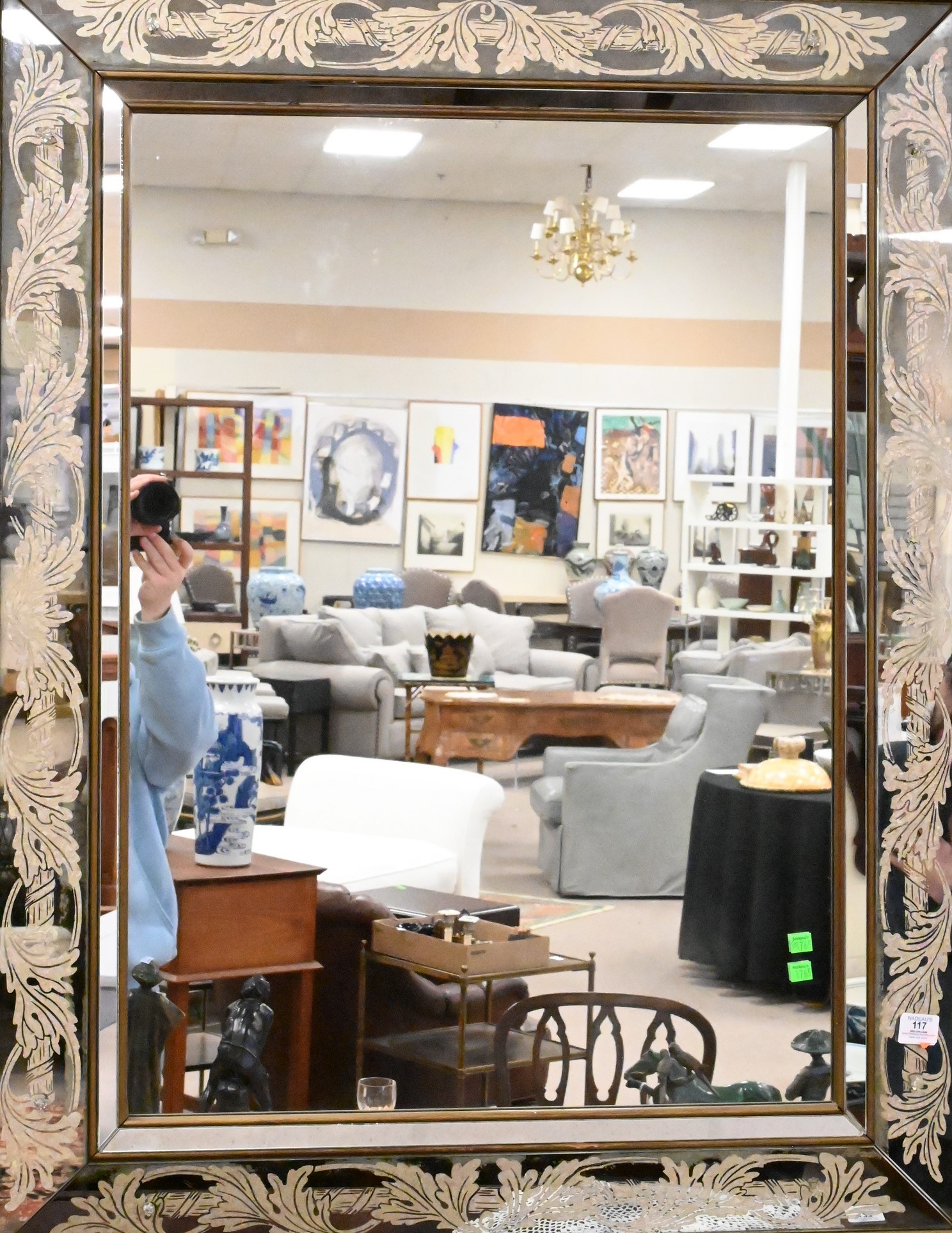 having rectangular plate with beveled and mitered mirrored frame and stylized scrolling foliage, French c.1950s