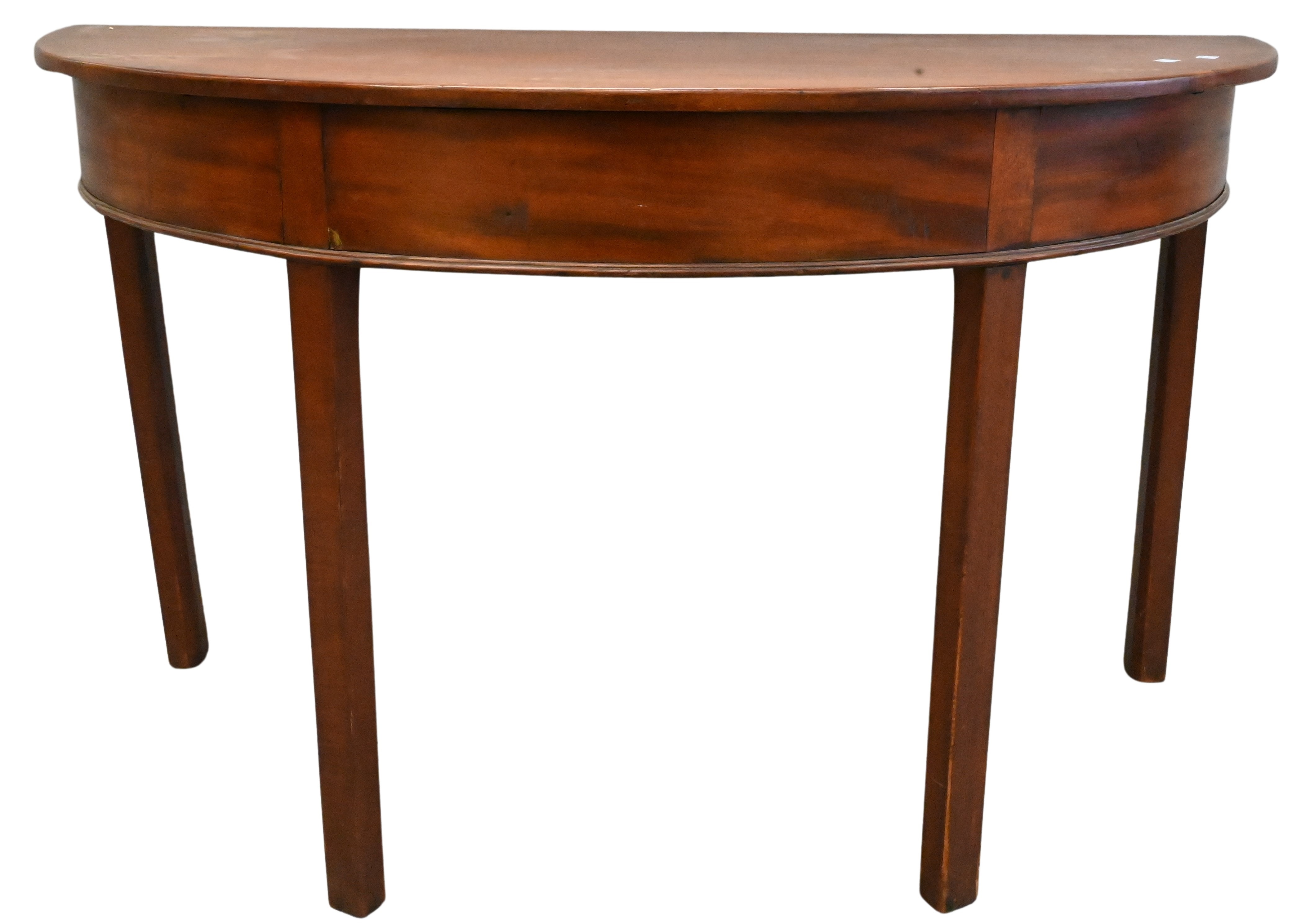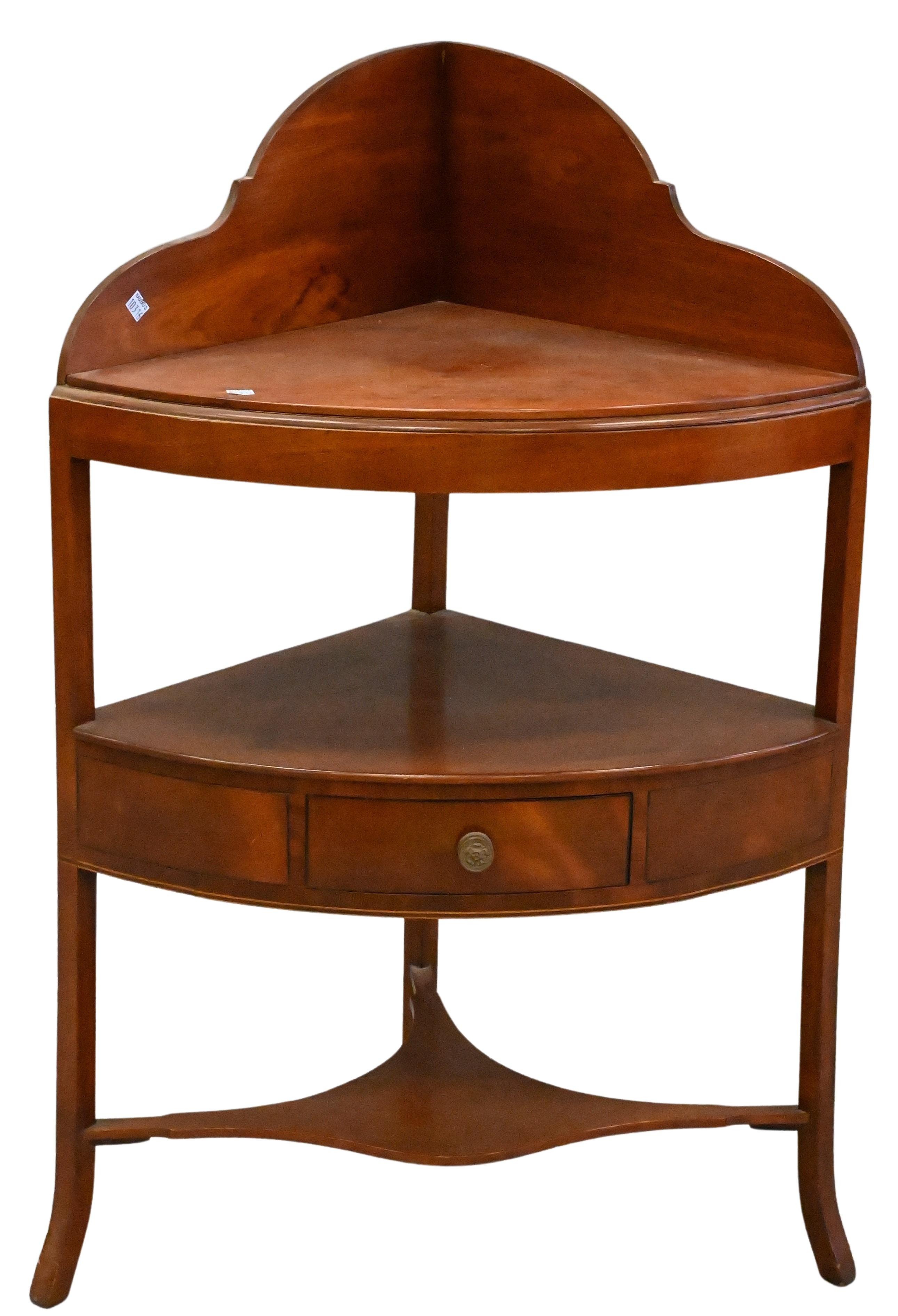 white console having one bottom shelf, Hoagland’s console having nailhead accents