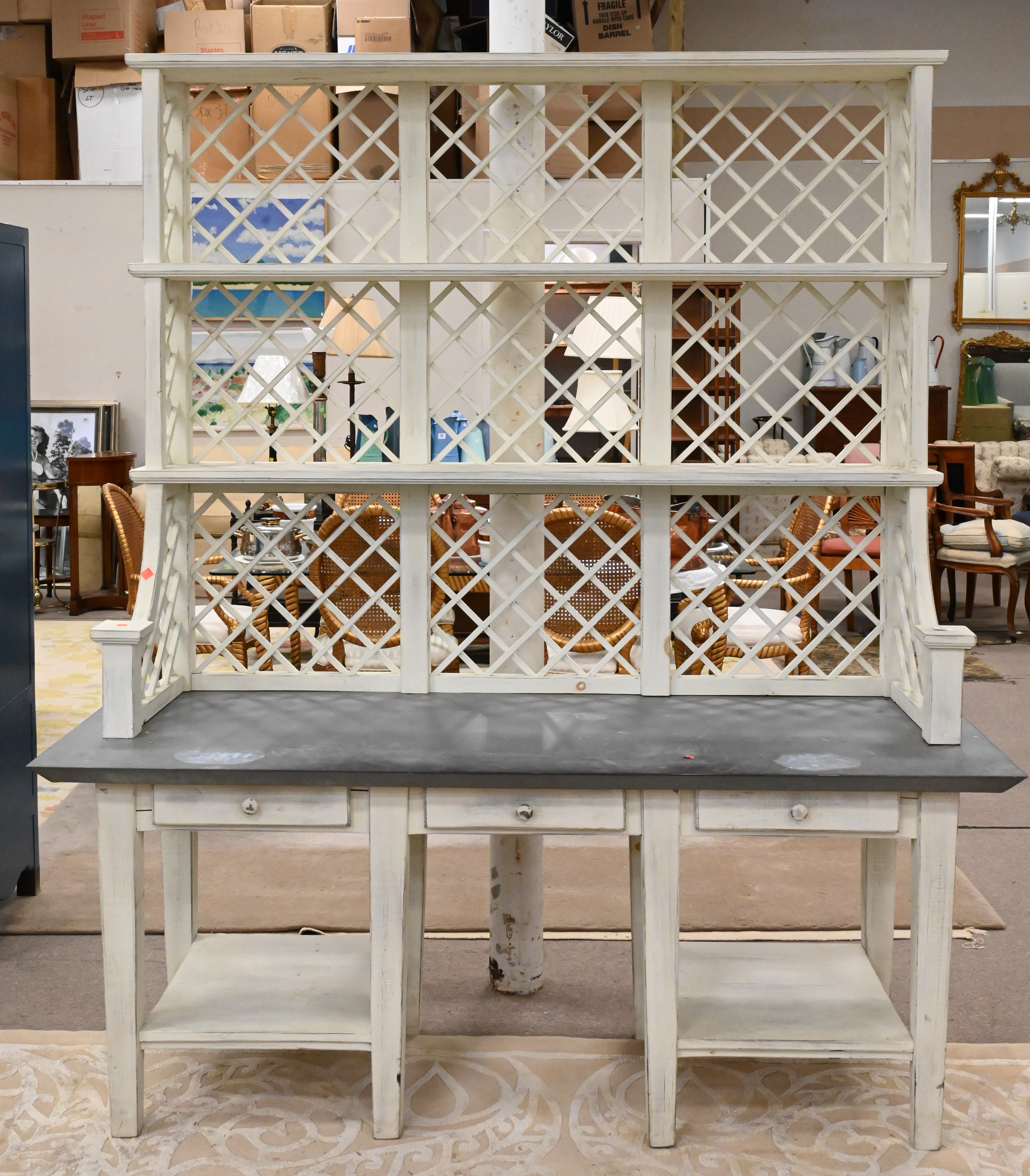 top having trestle back and open shelving, set on base having three drawers over additional open shelving