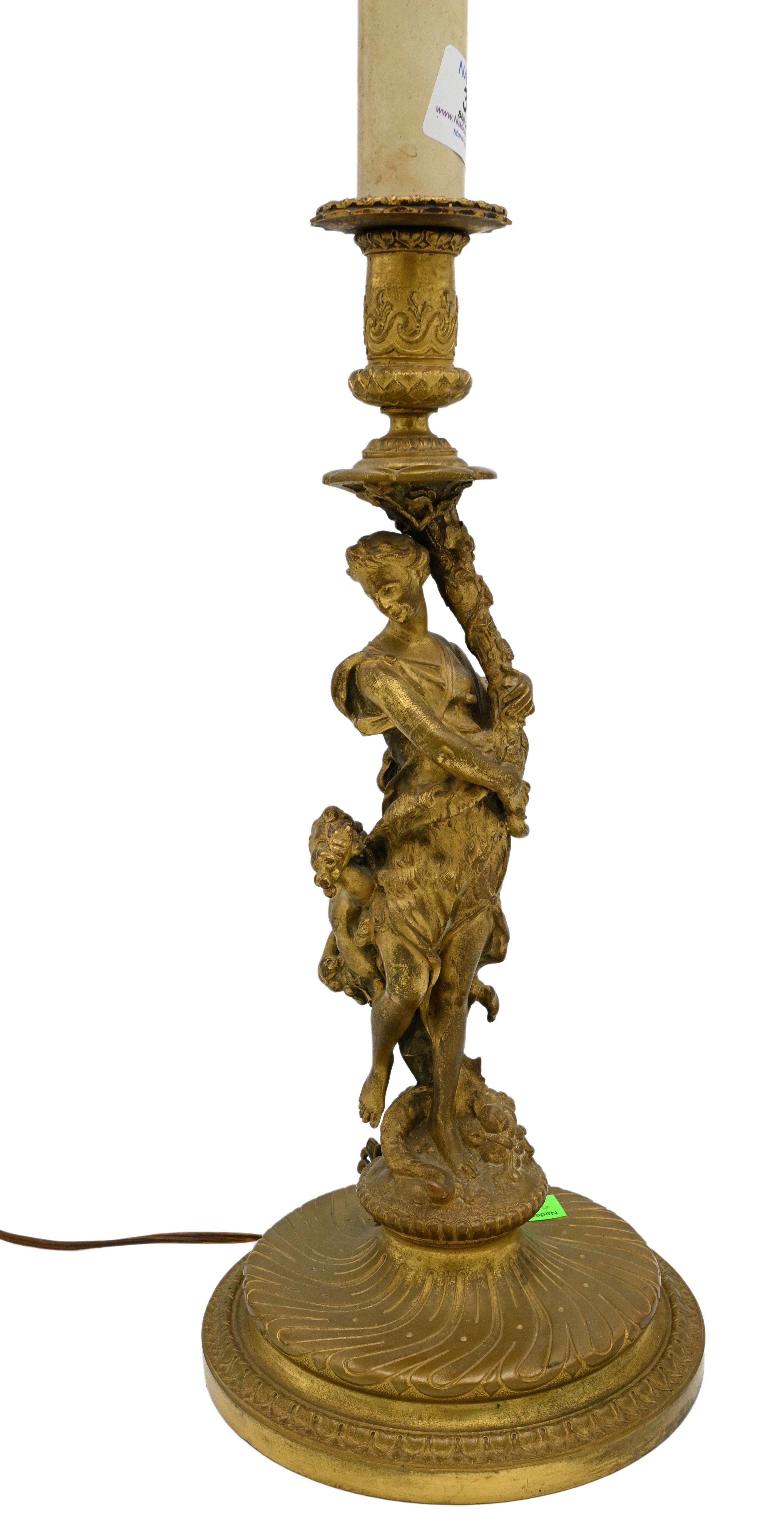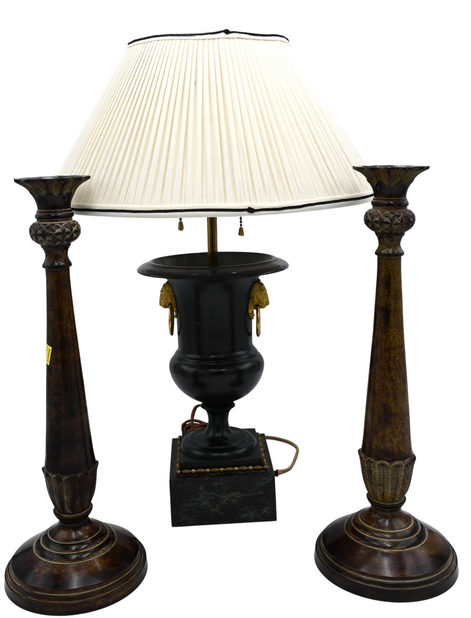 to include one iron urn form table lamp having gilt lion handles, along with a pair of bronze pineapple motif candlesticks