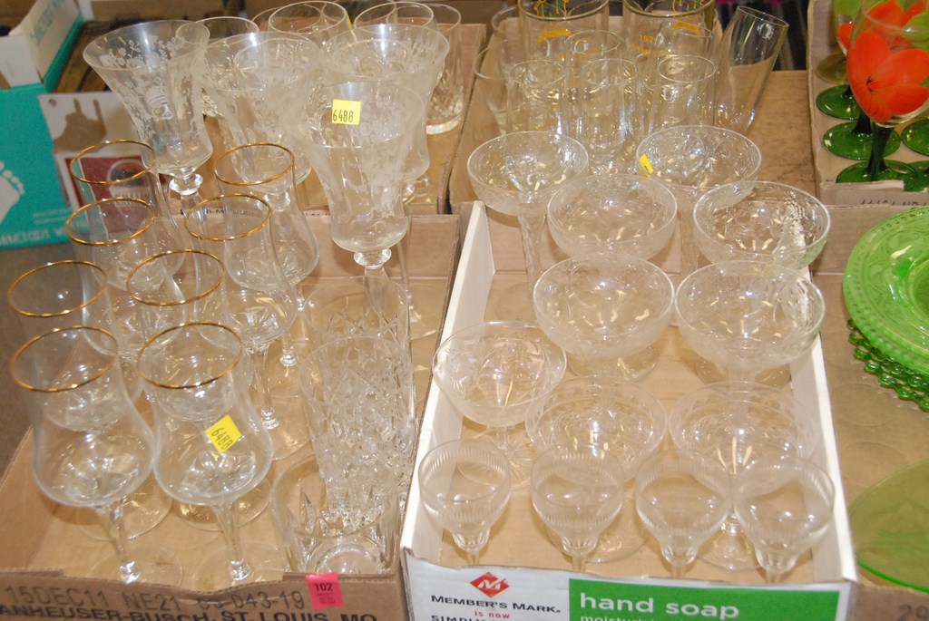 Five box lots of stemware painted stemware, set of five Waterford glasses, two Waterford salt and pepper, Tiffany & Co glasses, etc. Provenance: Estate of Judy Gengras McDonough of West Hartford, CT.