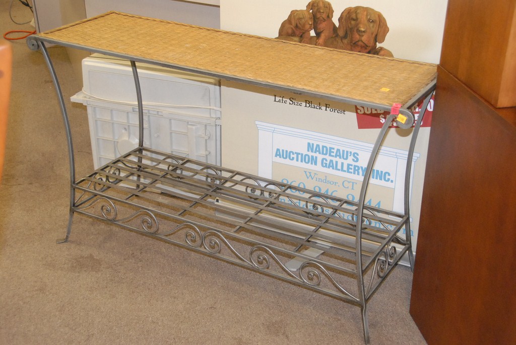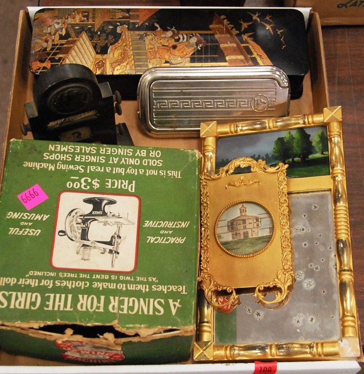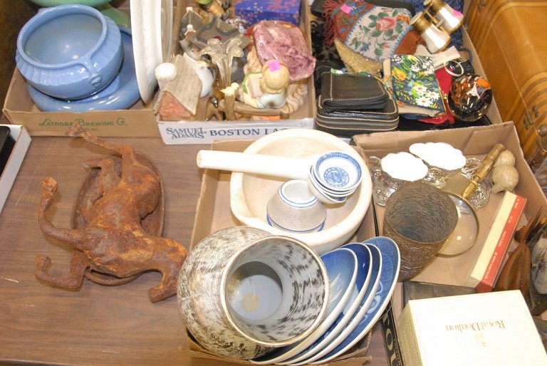 Group of smalls three jack in the boxes, tin tea caddy, letter box, Arthur Court aluminum dish, decorative pull toys, large bowl, marble cutting board etc. Provenance: Estate of Judy Gengras McDonough of West Hartford, CT.