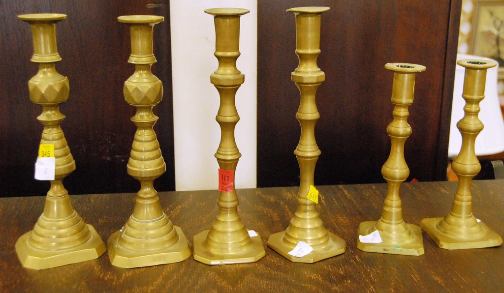 Group lot brass candlesticks, sconces, reproduction mini carriage, two brass buckets, copper planter, and wood candlesticks. Provenance: Estate of Judy Gengras McDonough of West Hartford, CT.