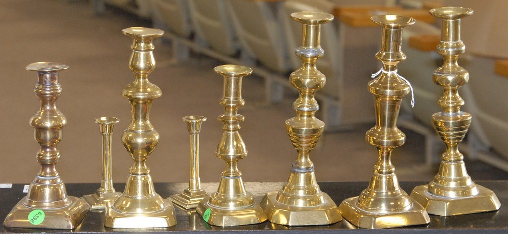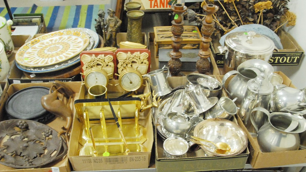 Eight box lots barometer desk set, pewter, silver plate, wooden candle sticks, wooden dish, two figures, brass items, etc.
