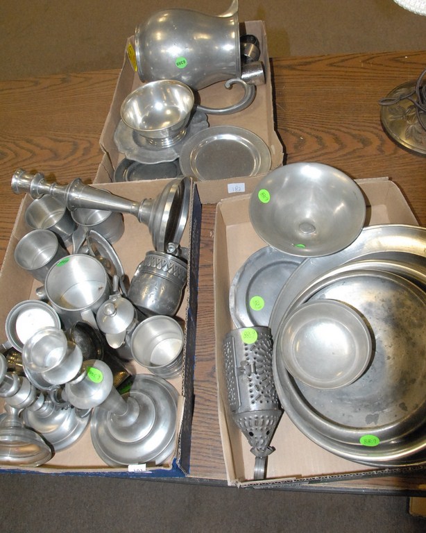 Three box lots of various pewter items dishes, bowls, cups, candlesticks, pitcher, etc.
