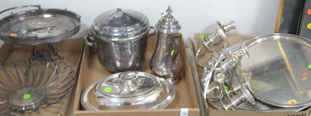 Three box lots of silverplate items footed tray, round tray, candelabra tops, covered vegetable dish, teapot, basket.
