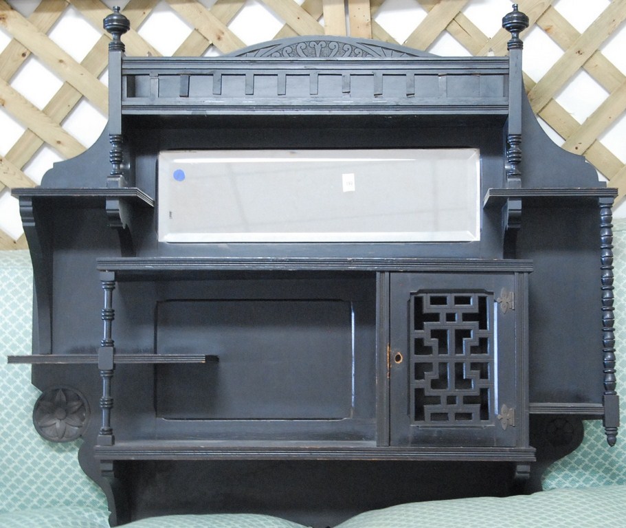 Ebonized Victorian hanging cabinet with shelves and mirror.