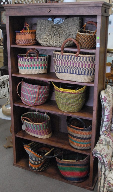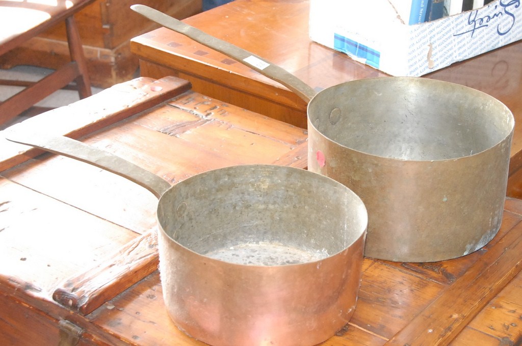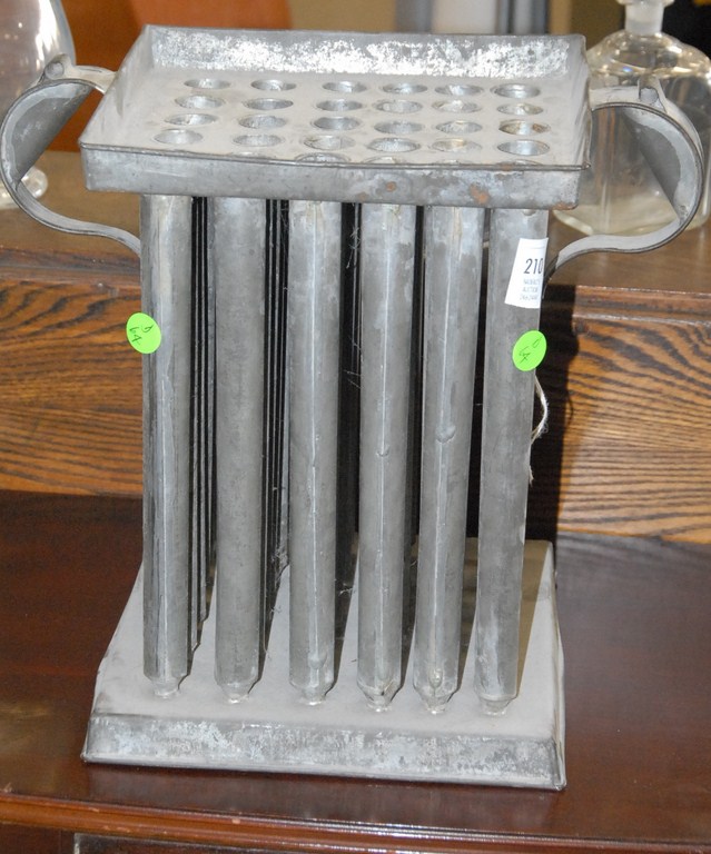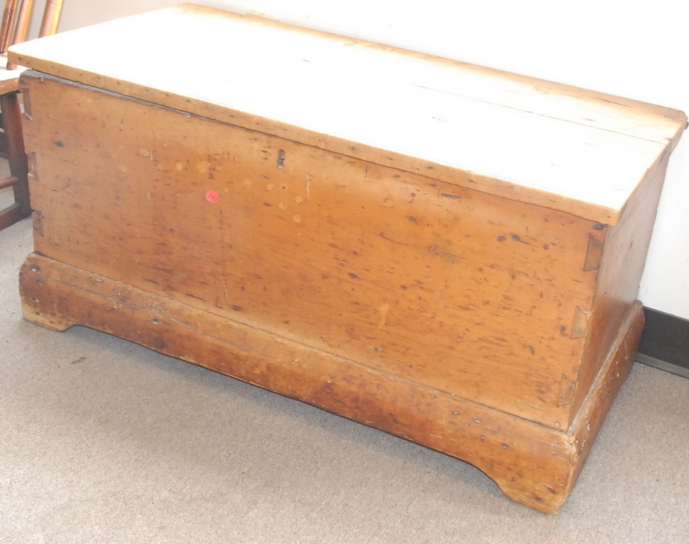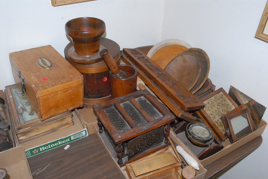 Primitive lot of five boxes foot warmer, small chest, mortar and pestle, wooden bowls and trencher, wooden molds, rolling pins, ship’s compass, double fold mirror and small primitive frames.