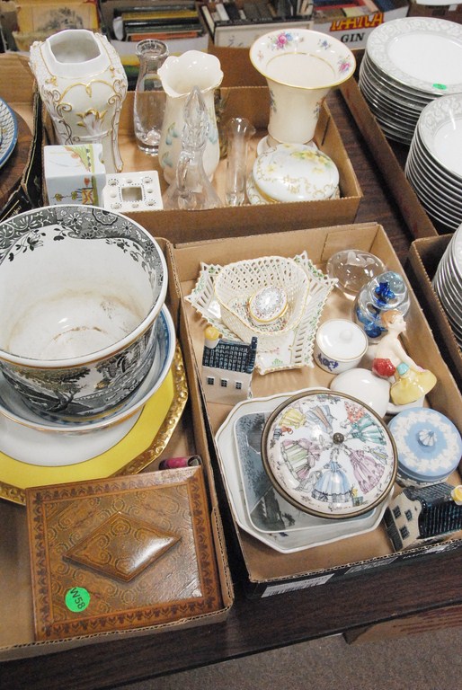 Nine box lots set of Japanese china dinnerware, crystal, glass ship in bottle, mugs, pressed glass, vases, Russel Wright bowl, etc.