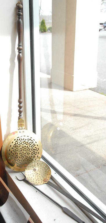 Group lot pierced brass bed warmer, strainer spoon, and iron fork.