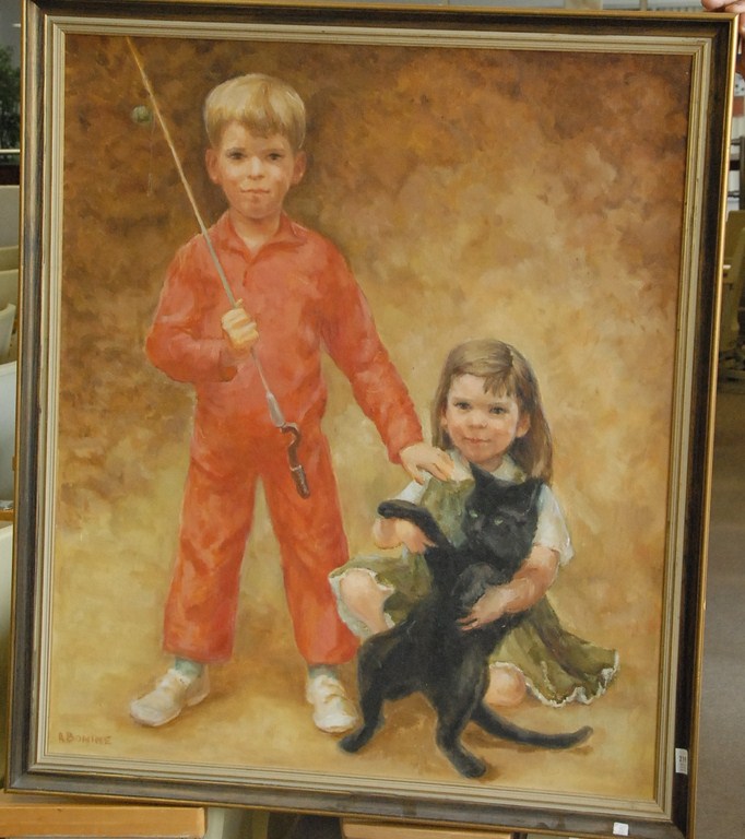Large oil on canvas portrait of young boy and girl with cat and fishing rod, signed A. Bonine, 40 x 34.