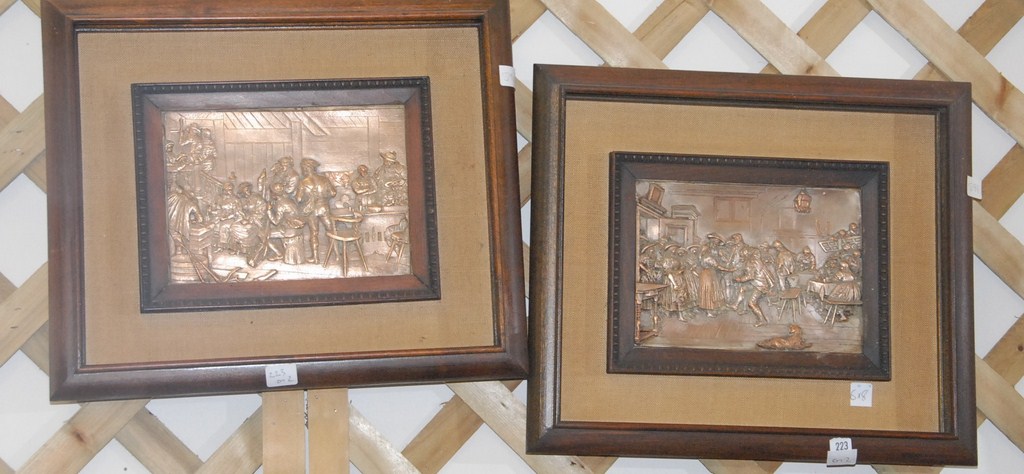 Pair of metal three dimensional plaques of interior scenes, probably Continental, 6 x 8.