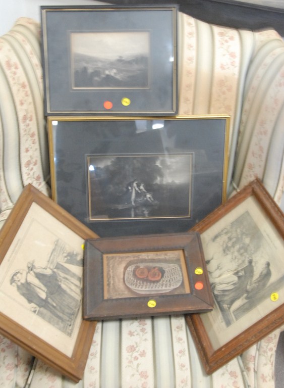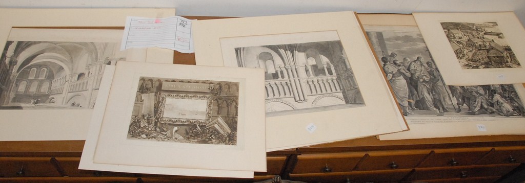 Group of unframed prints including two architectural prints, one town scape pencil signed, and early religious print.