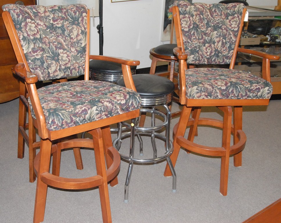Six bar stools including pair of Harley Davidson bar stools, pair of reproduction swivel top stools, and pair of bar stools with arms.