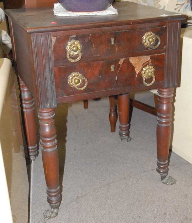 Sheraton two drawer work table with brass paw feet, circa 1830 veneer chips on drawers.