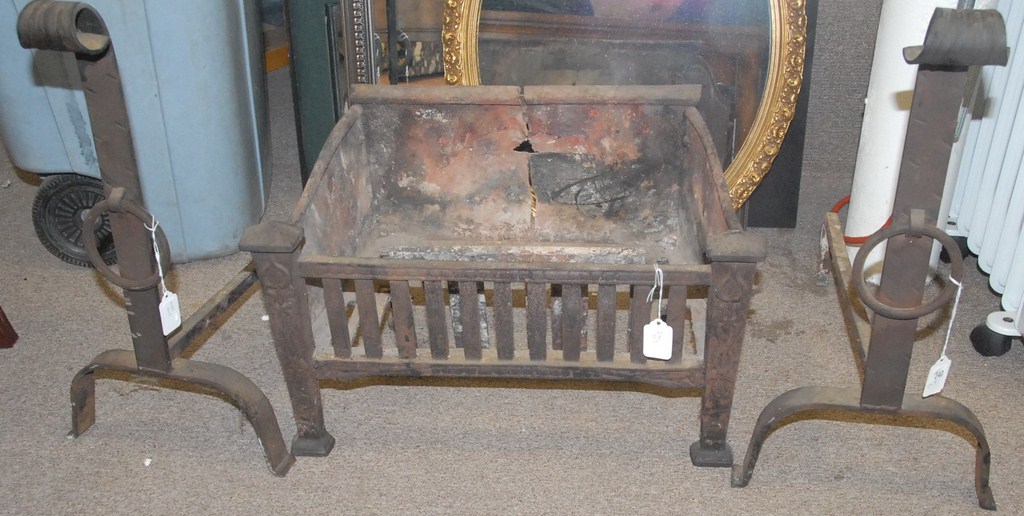 Pair of iron andirons and wood grate.