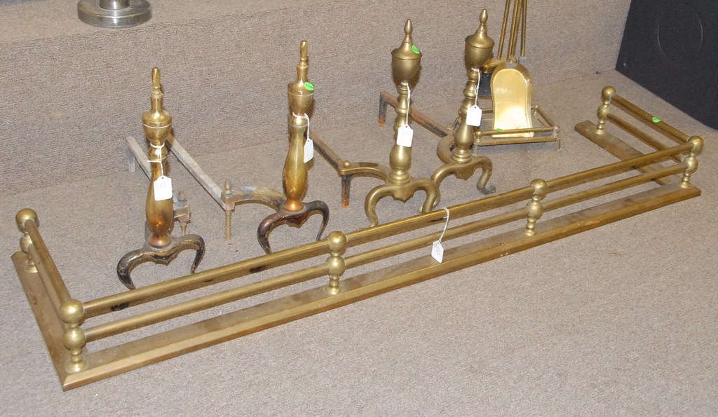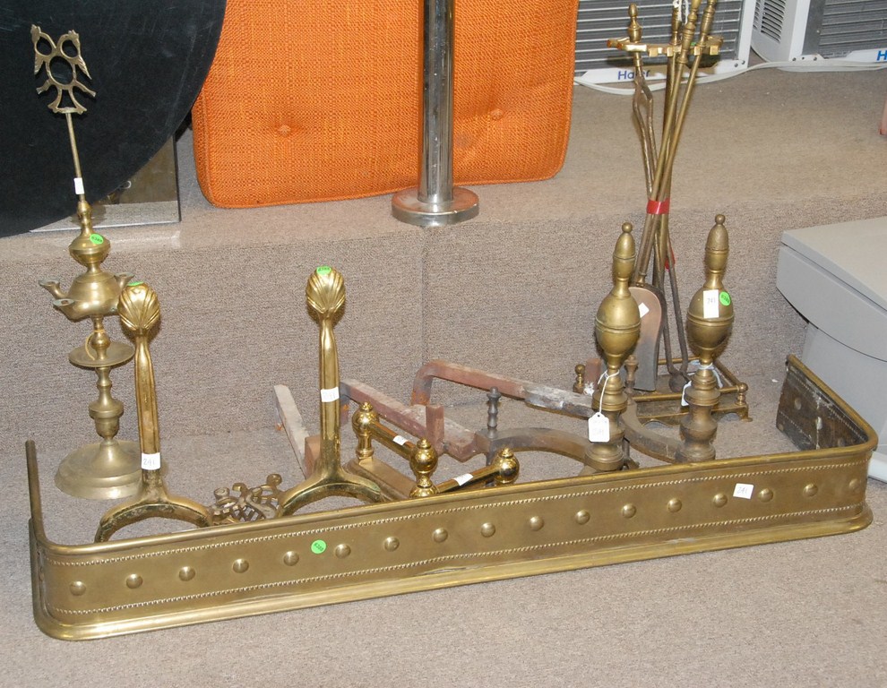 Lot two pairs andirons, fire tools, and brass fire fender.