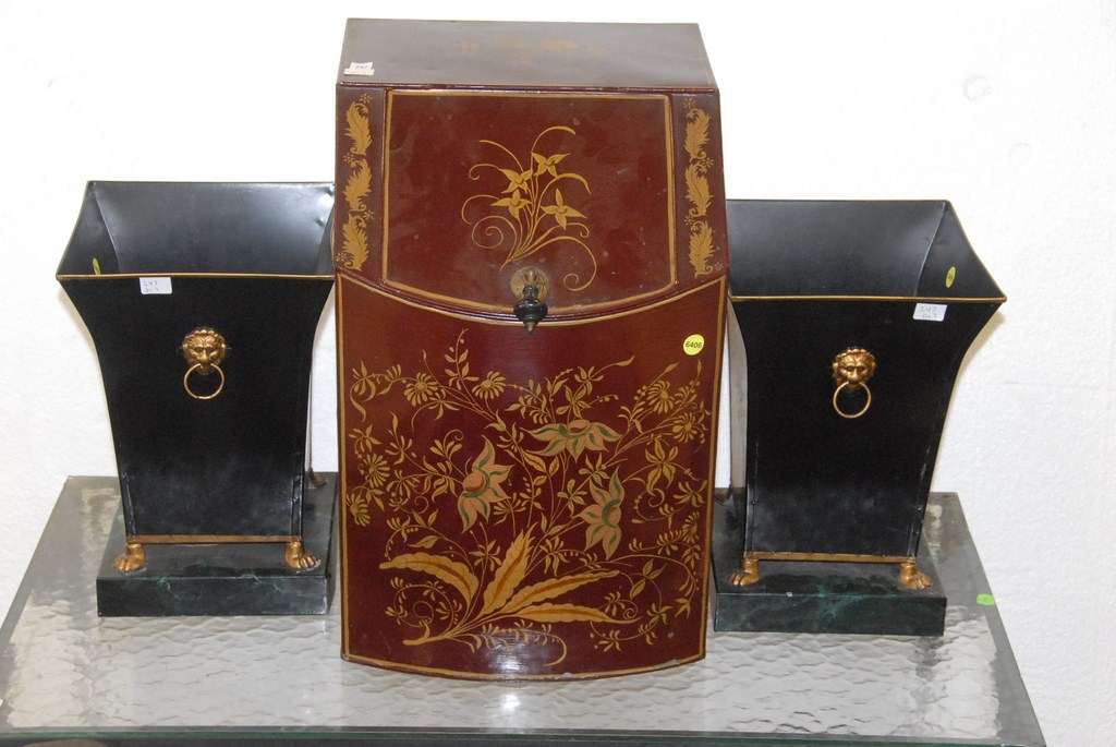 Three piece tole lot pair of large tin waste baskets, and tole tea box repainted.