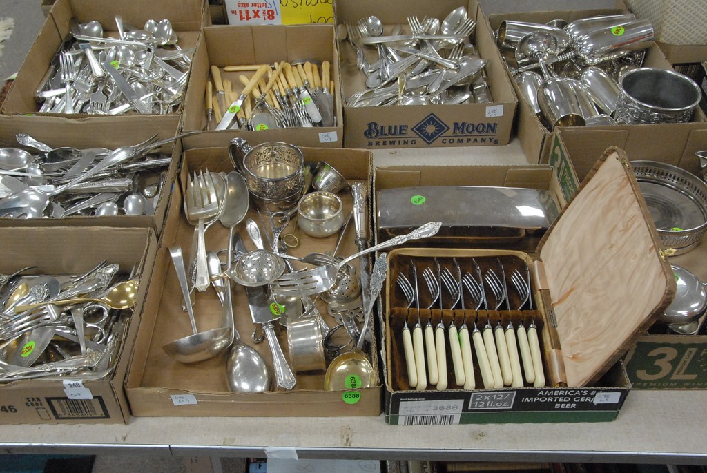 Nine box lots mostly silverplate flatware, wine coaster, silver plated rectangular box, fish set, and goblets.
