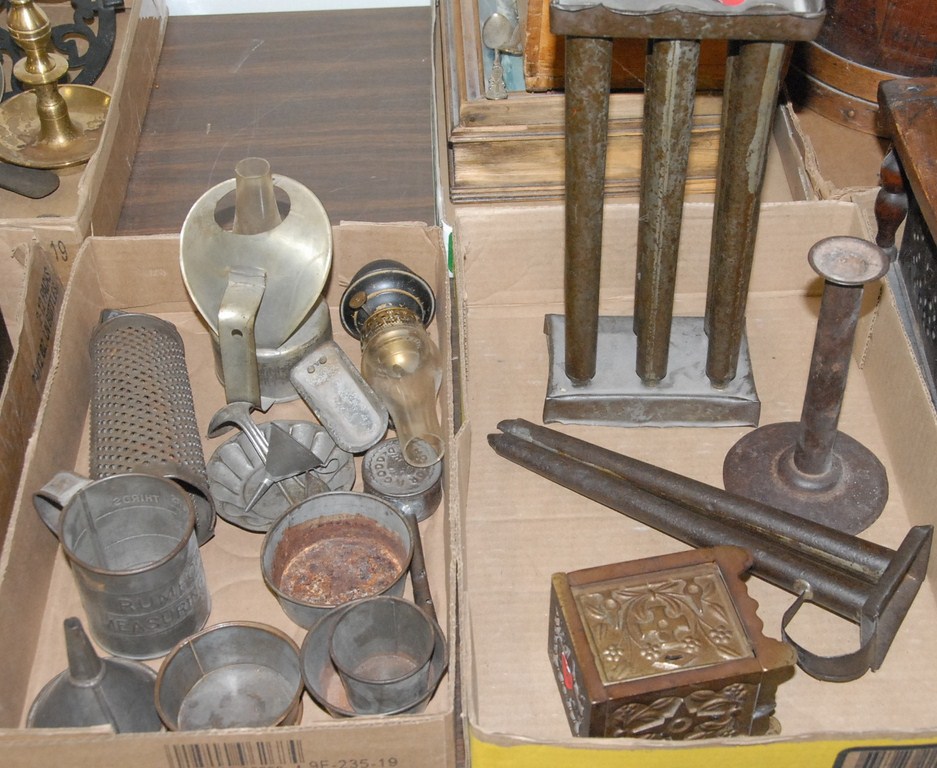 Two box lots of toleware candle molds, candlesticks, small cups etc.