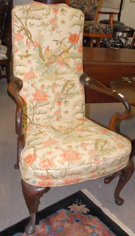 Pair of Queen style mahogany upholstered armchairs.