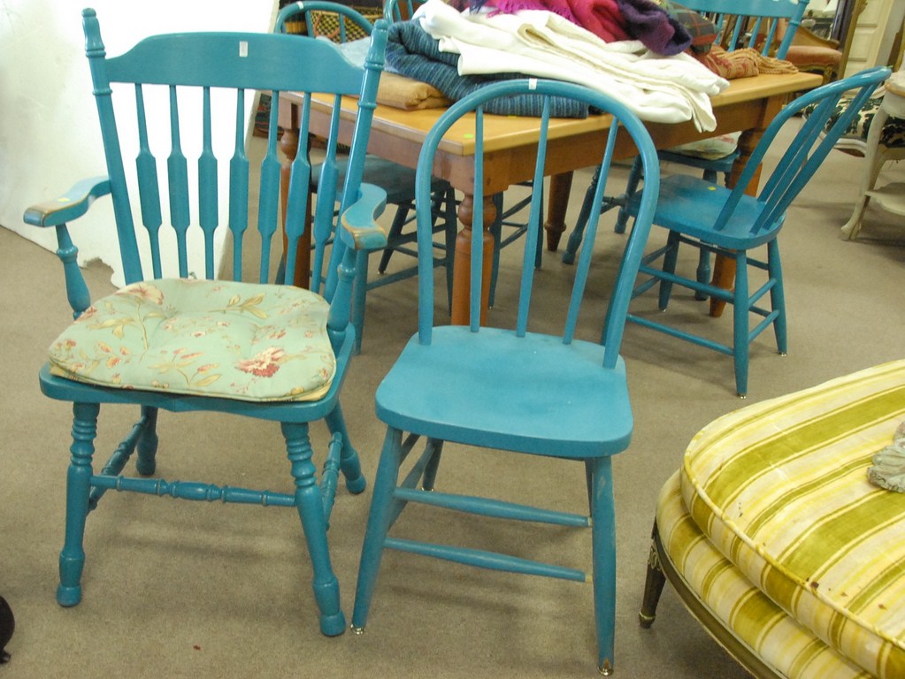 Group of six various blue painted kitchen chairs.