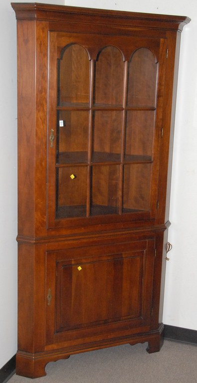 Cherry corner china cabinet with glass door top made by Old Town.