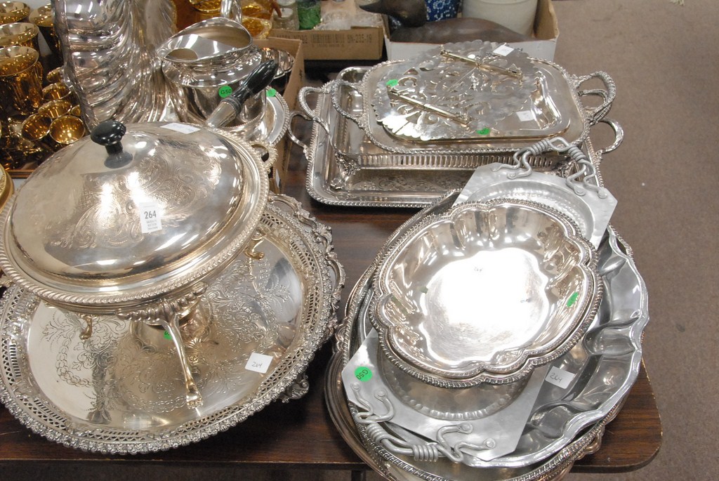 Large group of silverplate several trays, serving dishes, pitcher, chafing dish etc.