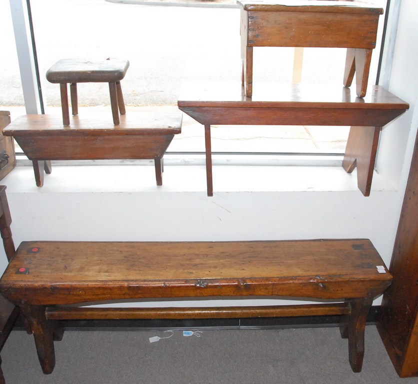 Primitive lot of five benches, five different sizes, longest 52.