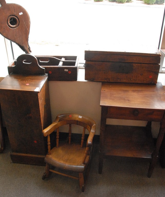 Primitive six piece lot wash stand, lift top chest, bellows, child’s rocker, lift top box, and tool tray.
