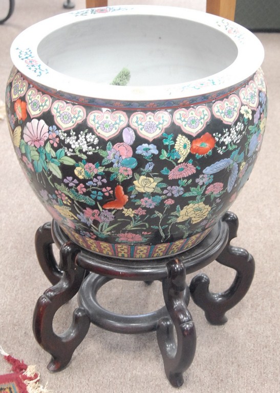 Chinese porcelain fish bowl on stand.