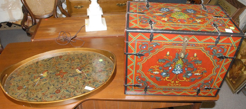 Two piece lot serving tray and paint decorated lift top box.